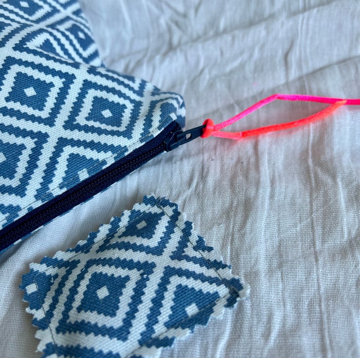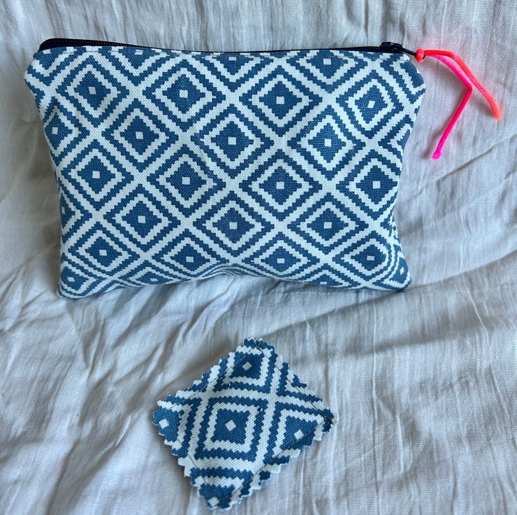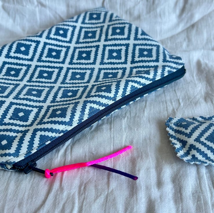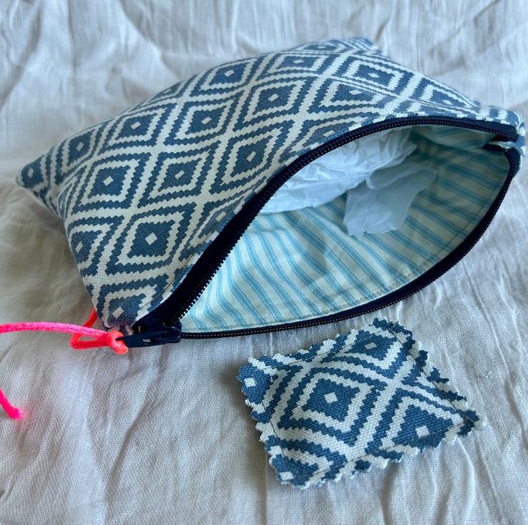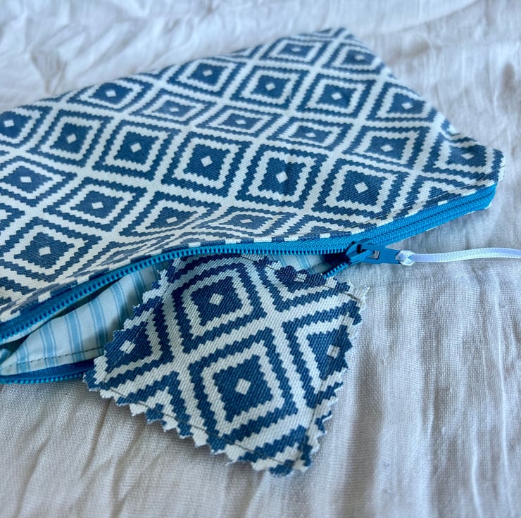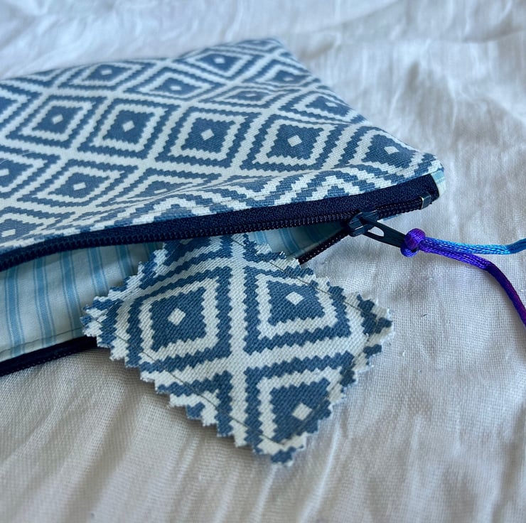 The pouch is made in a geometric blue and white design, and blue striped cotton lining.