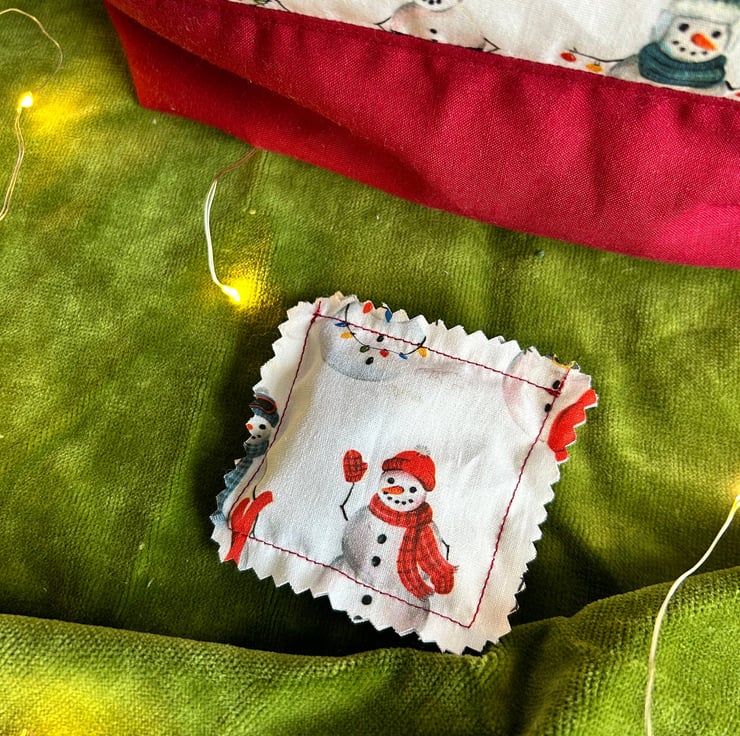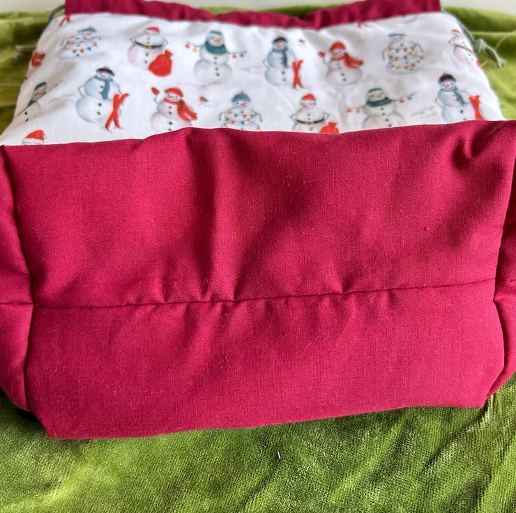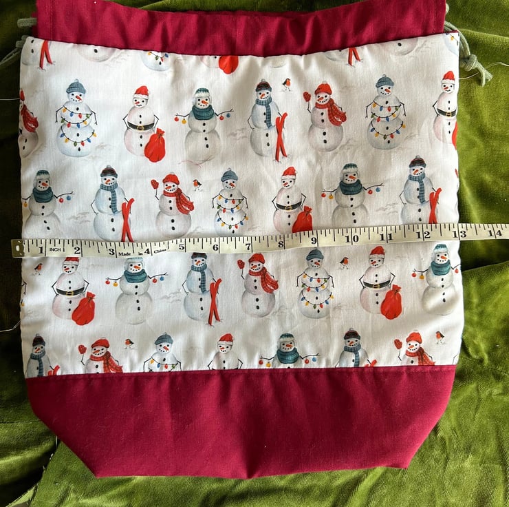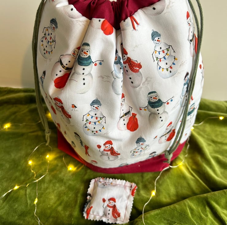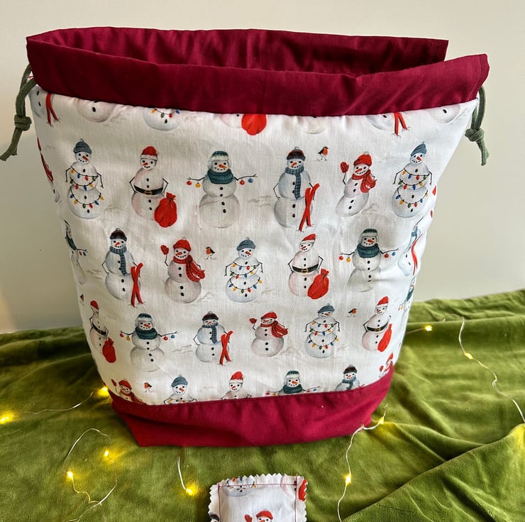 Large bags in a cute festive snowman printed fabric. The base and drawstring tabs are a deep red.