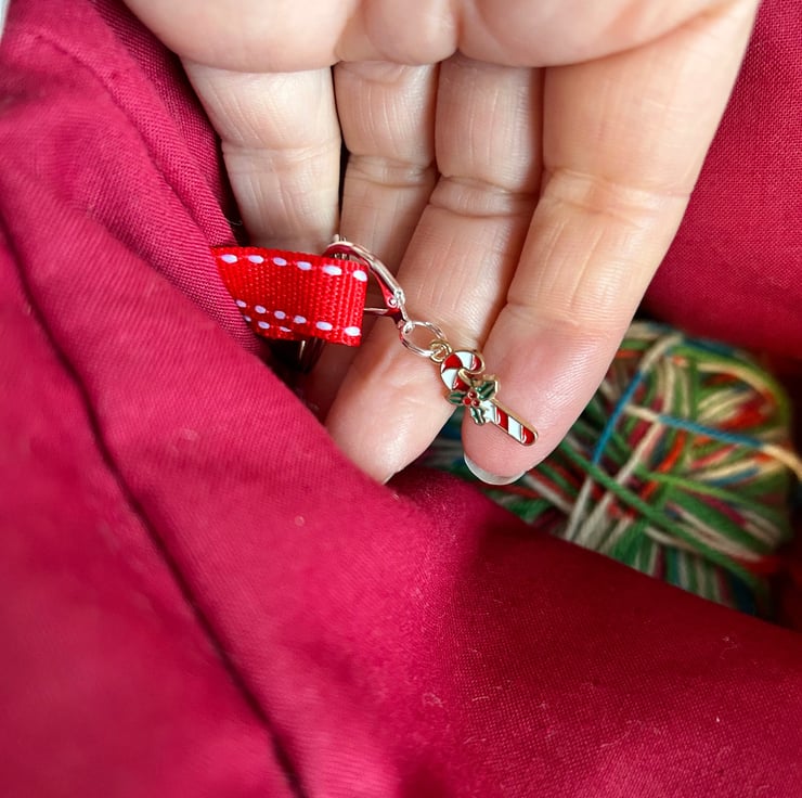There is also a key ring and lavender sachet inside. A little candy cane stitch marker included.