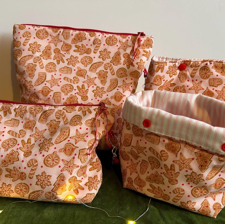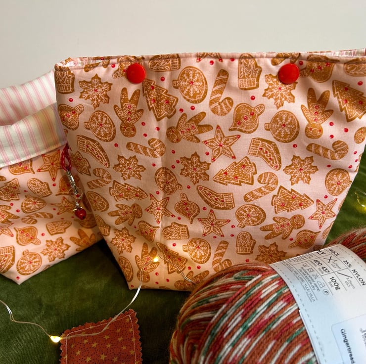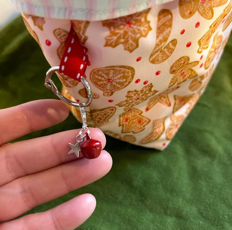 This bag has red poppers. Pink ticking stripe lining. Keyring with Christmas charms. Lavender sachet.