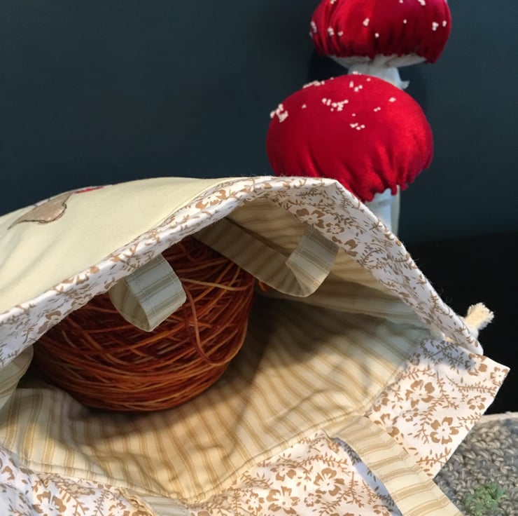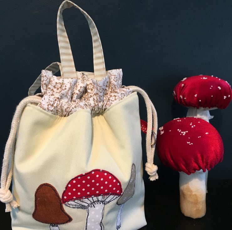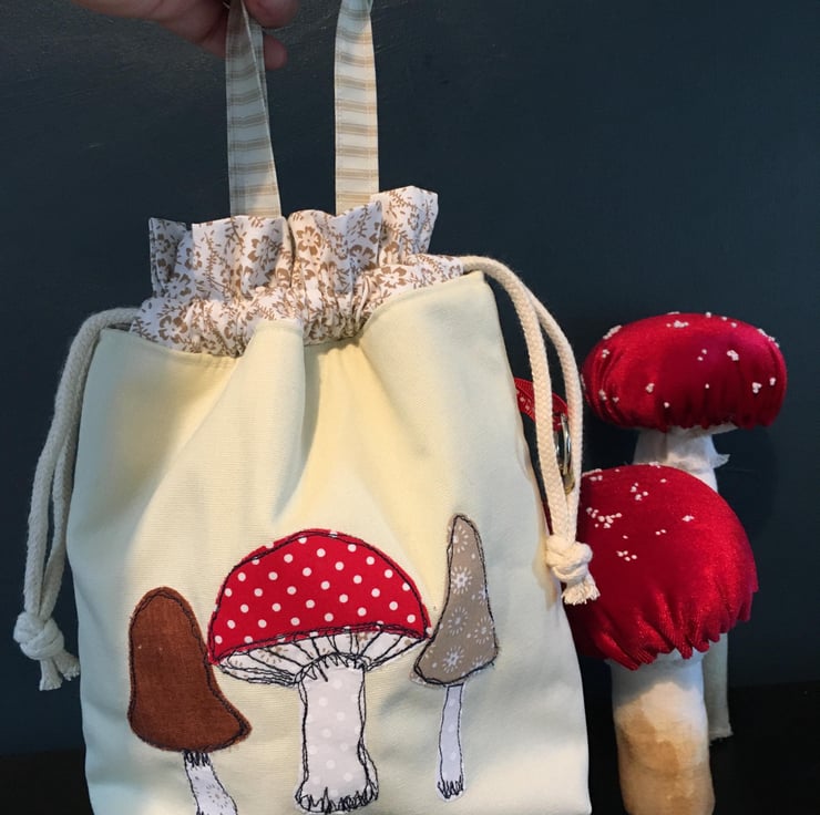 These two unique bags have had mushrooms appliqued onto the canvas fabric from pretty cotton fabrics. I have then free motion embroidered over with my sewing machine.