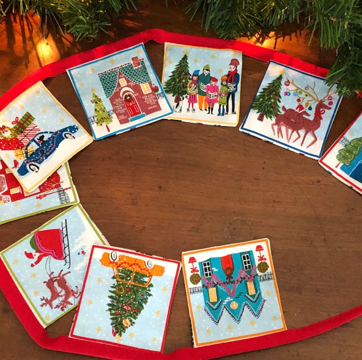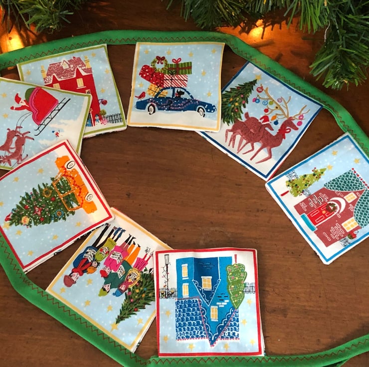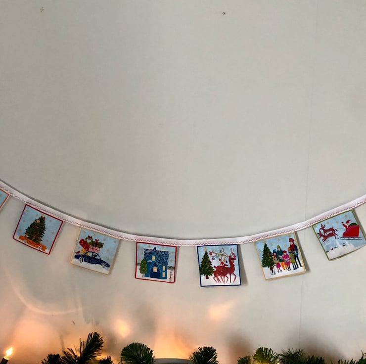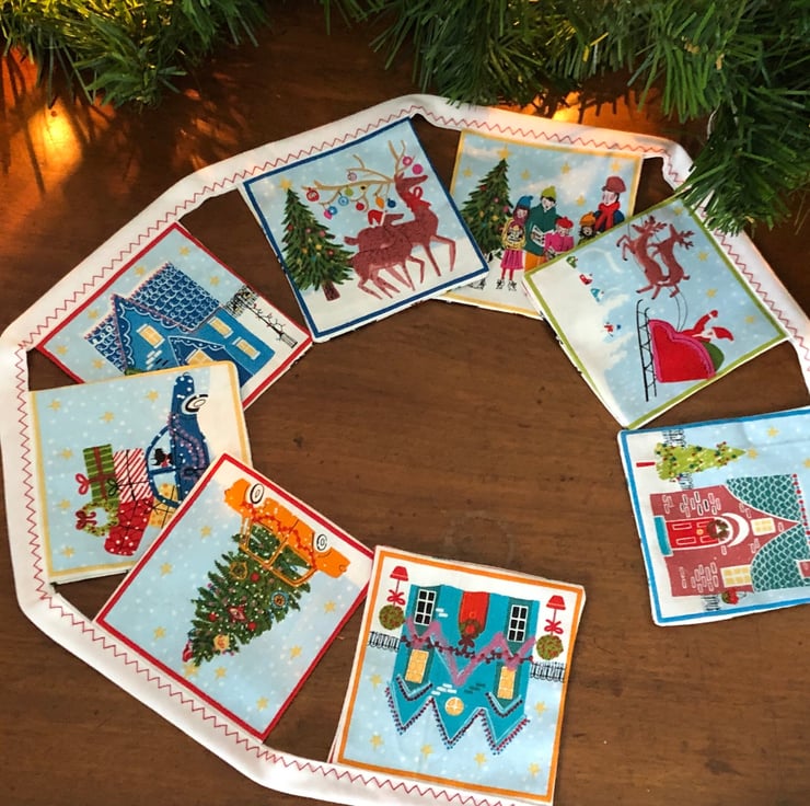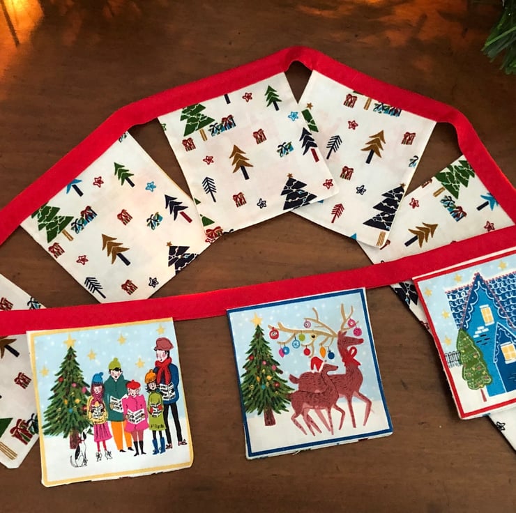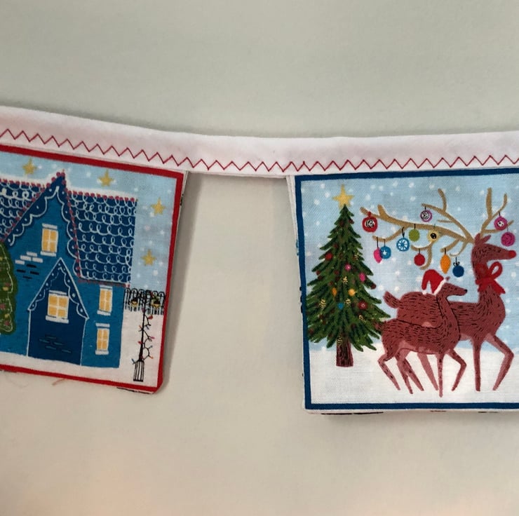Handmade by myself I have four Christmas bunting showing different traditions of Christmas. Backed in a Christmas tree fabric with contrasting tape.