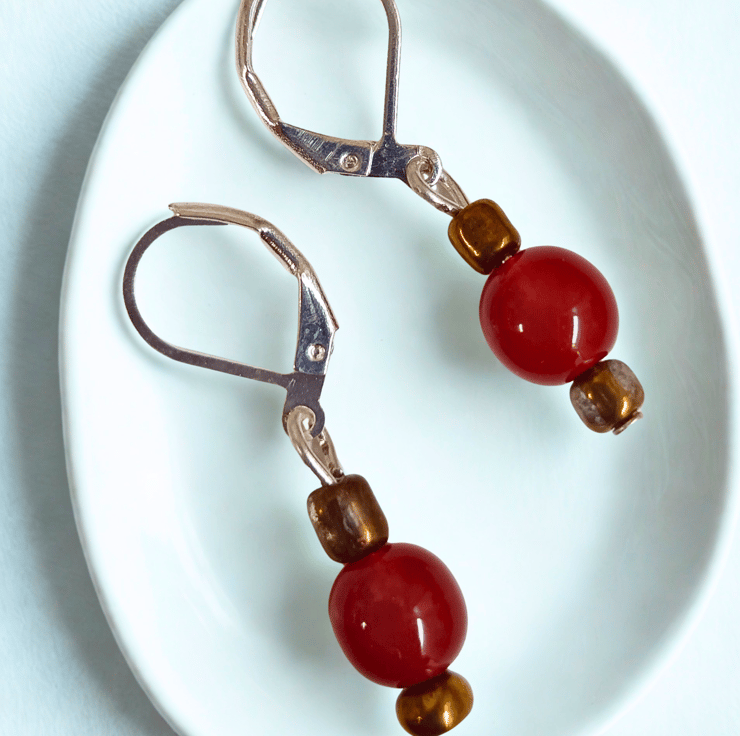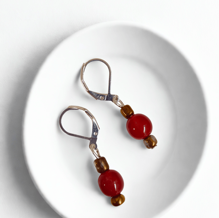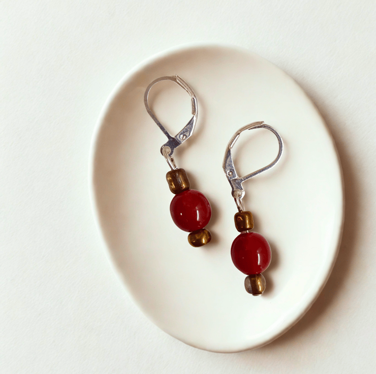 Tiny ceramic deep berry red beads with really tiny antique gold coloured beads. On nickel free 925 silver lever back hooks.