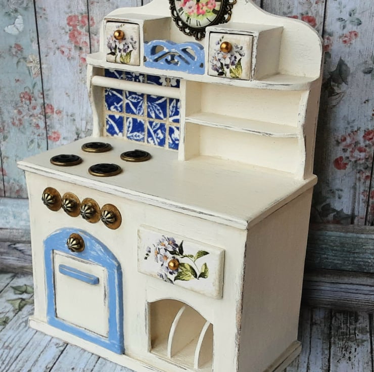 There are lots of lovely details; a cabochon clock, shelves, a rail for utensils, and drawers decorated with rice paper. The tiles are handmade from clay, decoupaged, and grouted to look authentic.