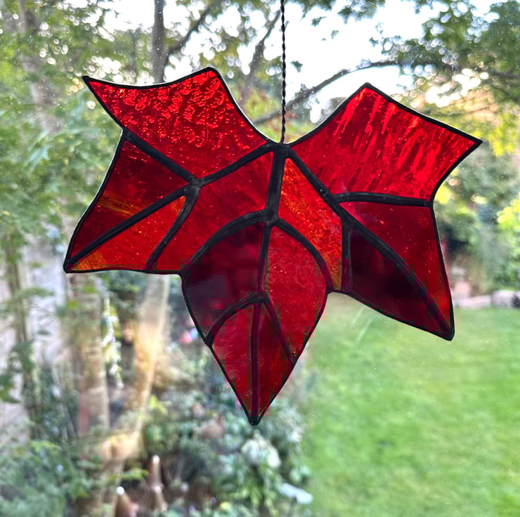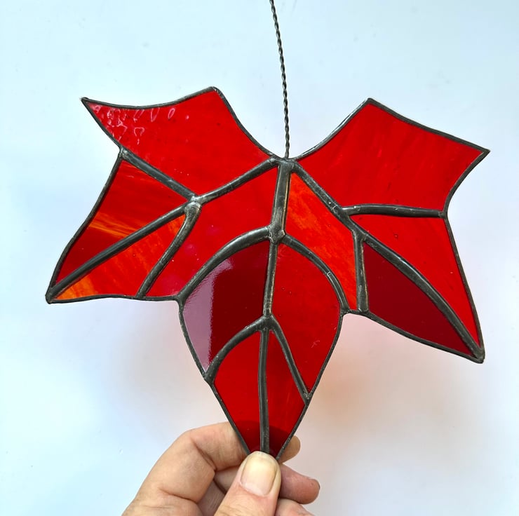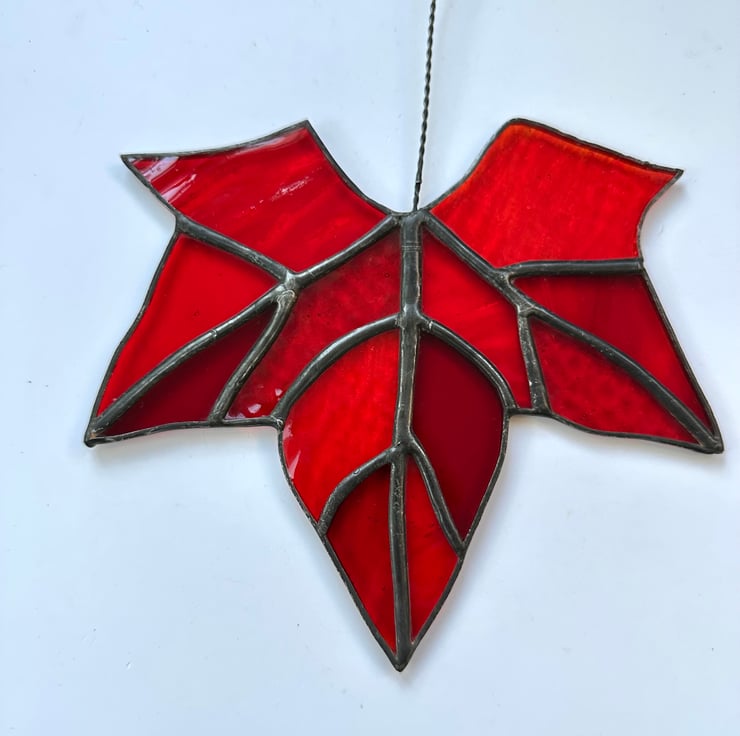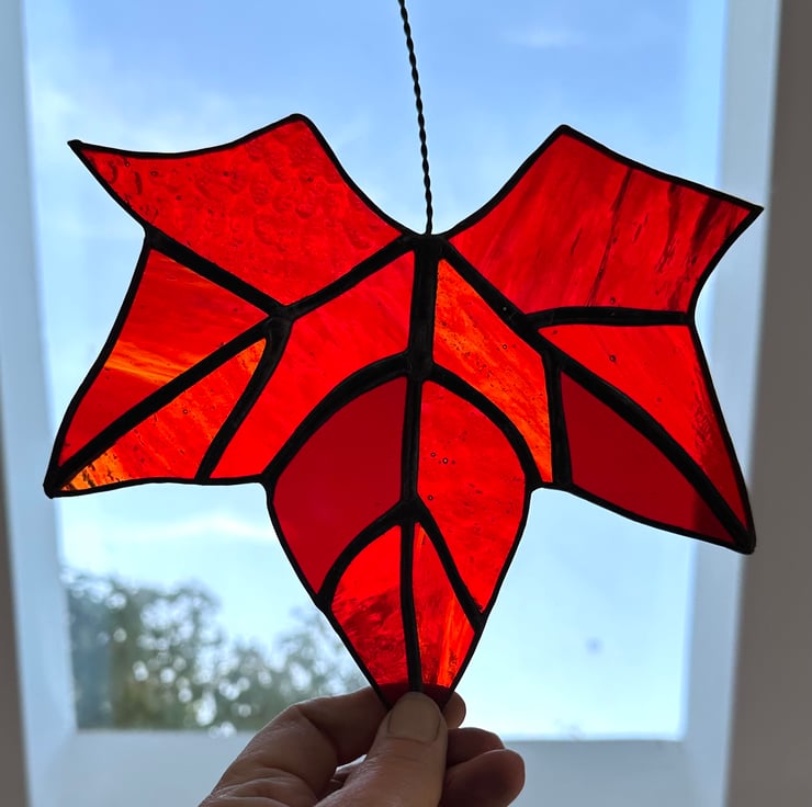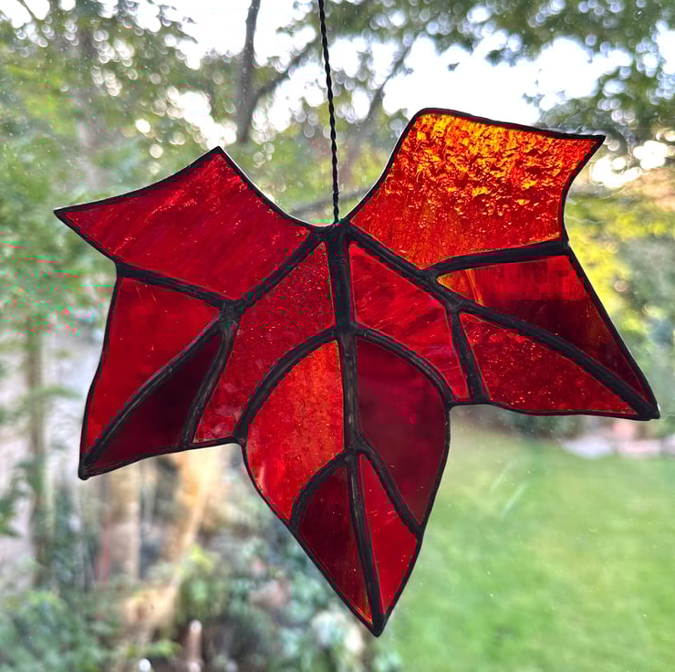 Maple leaf suncatcher made in shades of red glass by Carole’s Glass.