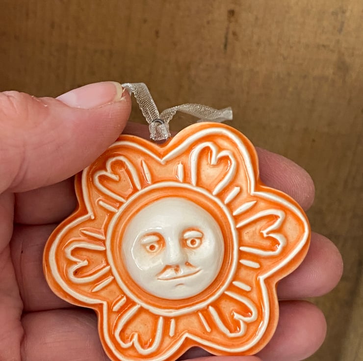 This unusual flower decoration is made from white earthenware clay and has a little moon face in the centre.It has been fired twice, once to the bisque stage and then a second firing for the glossy glaze. It measures 6 centimetres wide x 5cm height x 1cm thick and hangs from a cream organza ribbon.