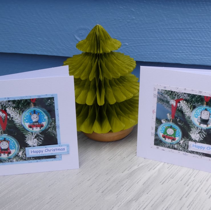 Each card has been handmade with a photograph of Christmas tree baubles featuring Thomas the Tank Engine and friends. (I made the baubles for my daughter when she was two and a massive Thomas the Tank Engine fan.)