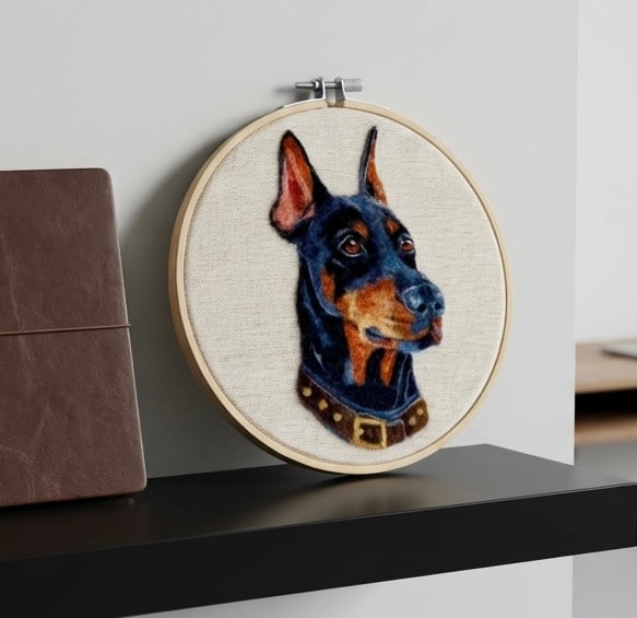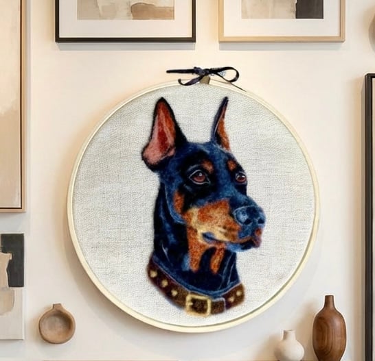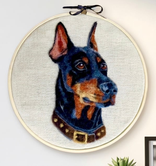 Bring a touch of charm to your home with this handcrafted needle felted Doberman presented in an embroidery hoop. Perfect for dog lovers this unique piece captures the sleek, loyal essence of the Doberman in soft wool making it a delightful addition to any wall or shelf.