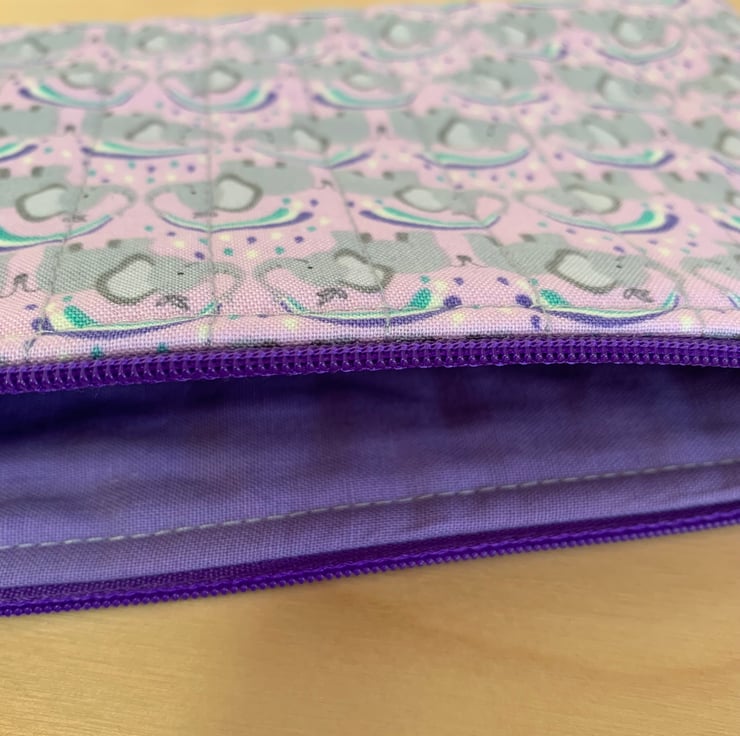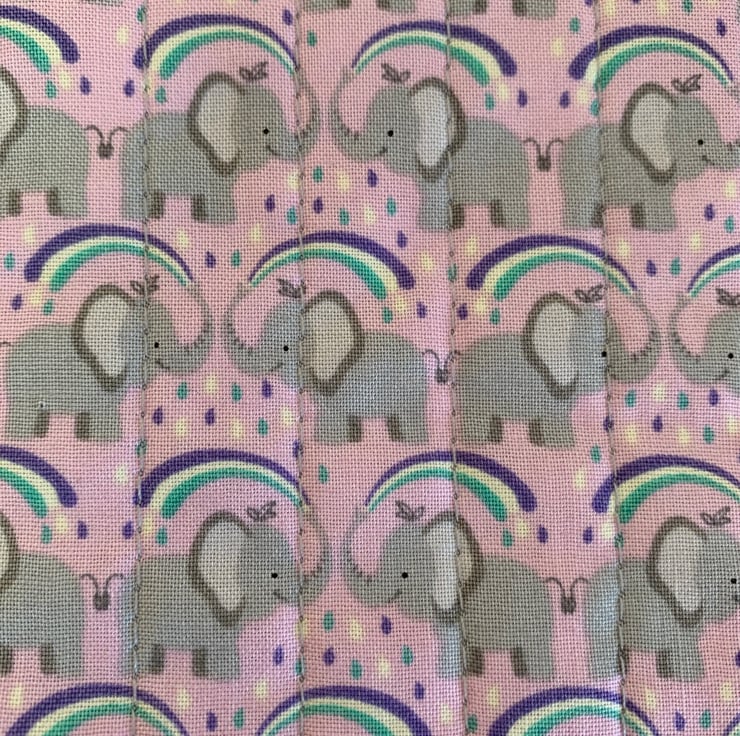 The pouch features baby elephants on a pink background, and is quilted with lilac stitching.