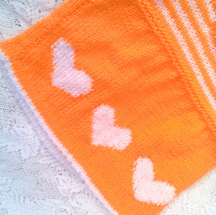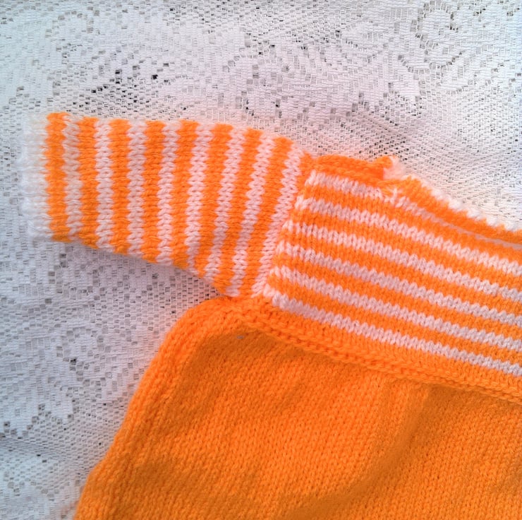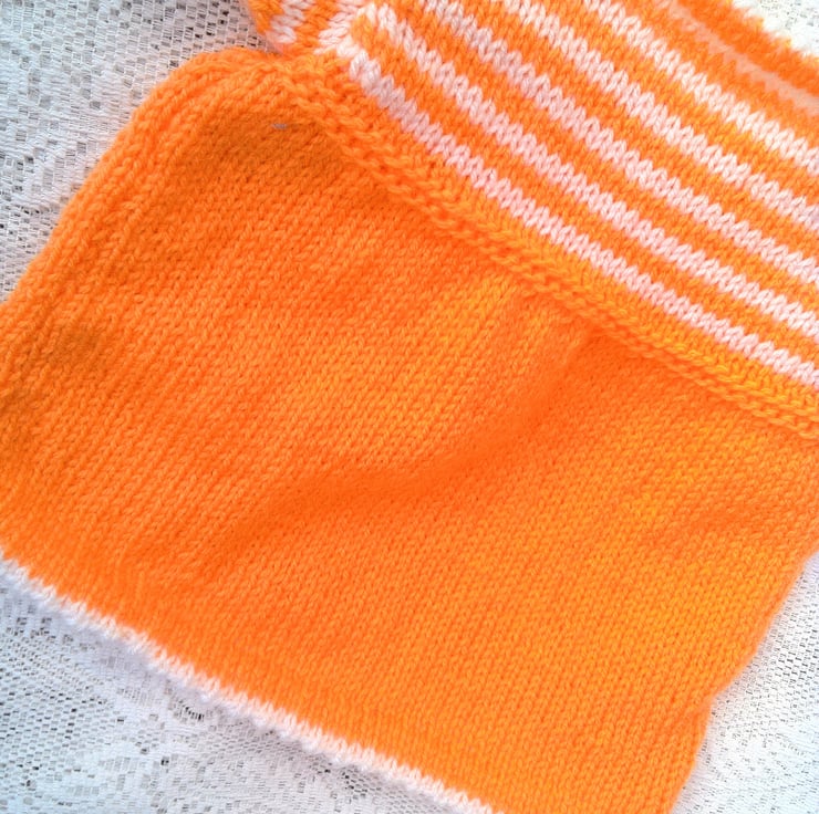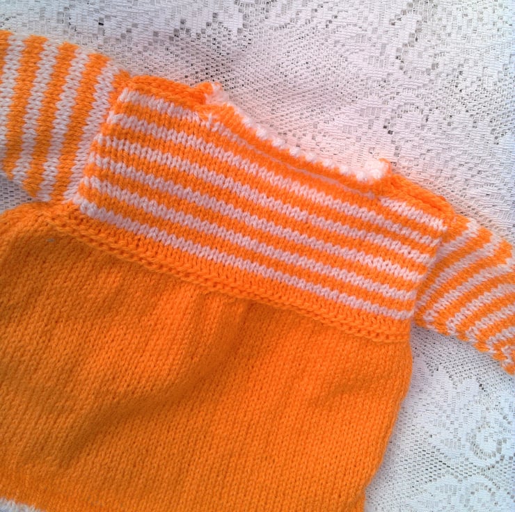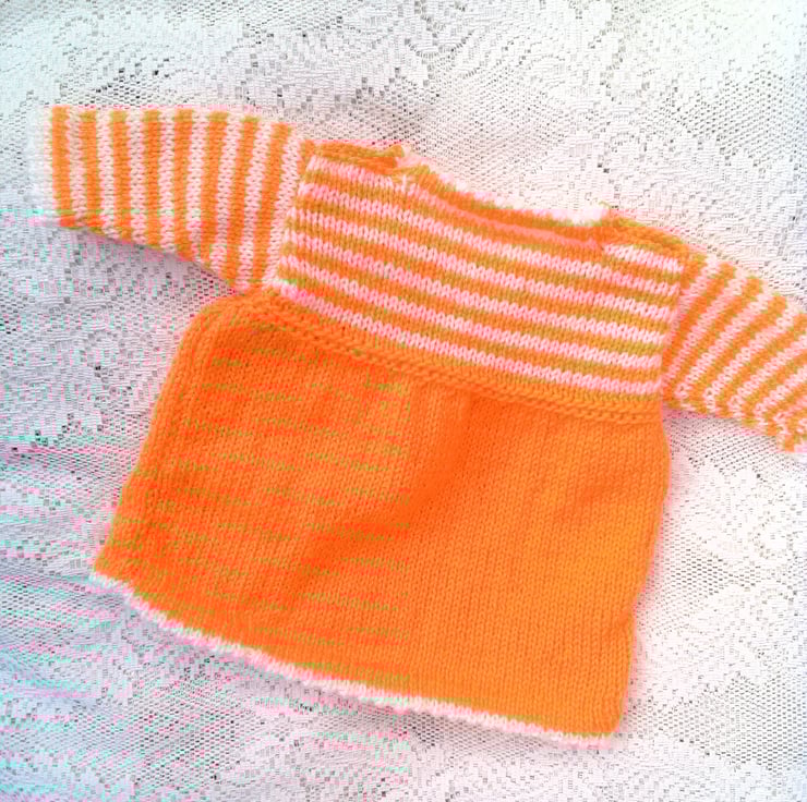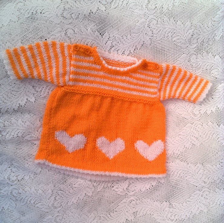 A pretty tangerine and white dress for a baby girl, hand knitted using acrylic double knitting yarn. The dress has a plain skirt with 3 white hearts on the front. The top of the dress and the sleeves are striped and it is fastened by two pretty flower buttons on each shoulder. It is in stock in the colours shown and is to fit a newborn baby with a 14 inch chest. It would make an ideal gift for a new born baby, a baby shower or as a Christening gift.The baby's dress can be made to order in other colours, sizes and yarn types. The available sizes are shown below, please state the colour required when you order and if you want a yarn type other than acrylic then please message me to discuss further. The processing time will be approx. 2 weeks to produce and post to you.