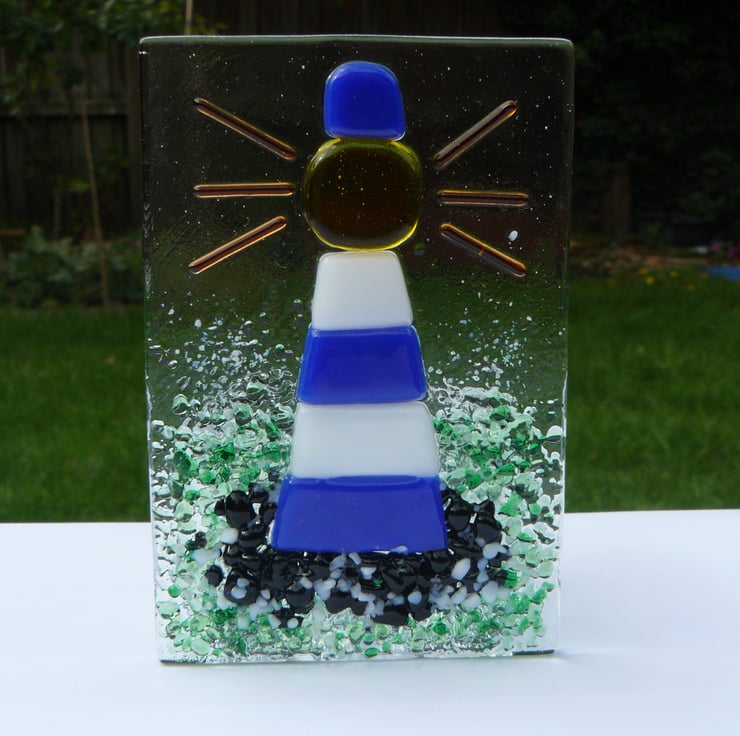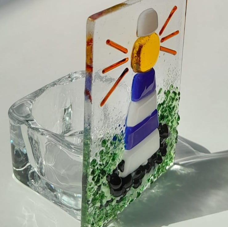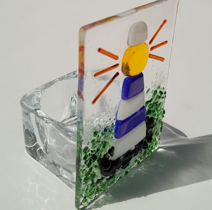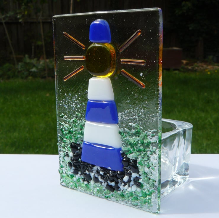 Handmade fused glass tealight holder featuring a blue and white lighthouse on a rock in the sea. Made to be a beacon of colourful light in your home.