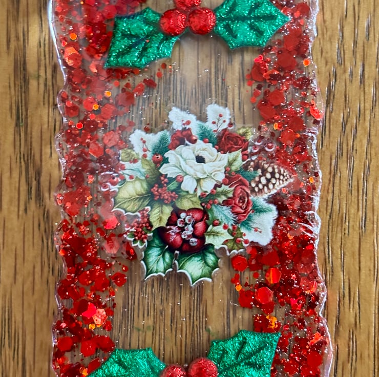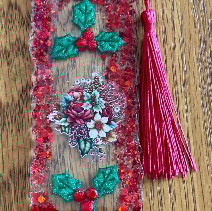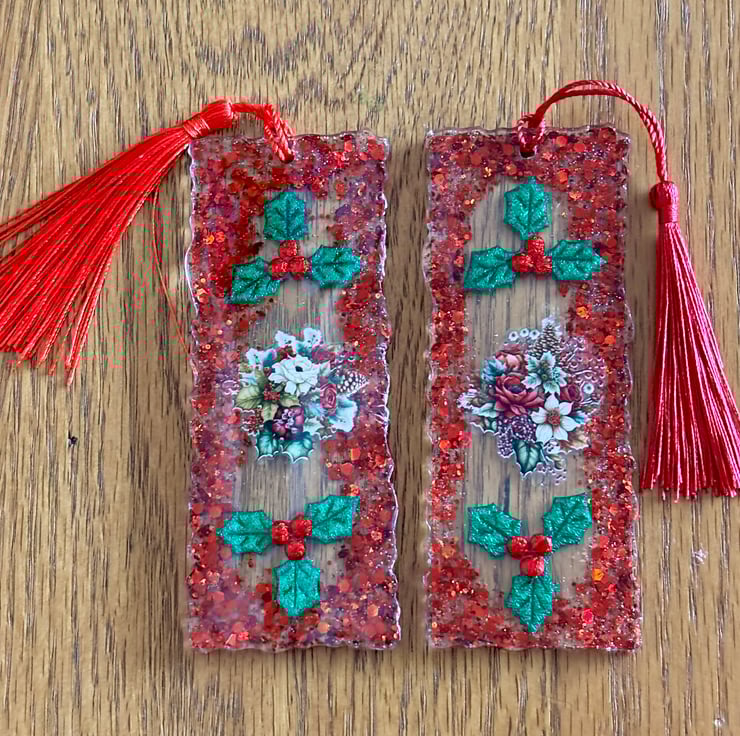 These are some Christmas bookmarks. They are made of resin, but have holly, berries and a flower arrangement image. The border is embellished with a red sequined glitter, the edges are wavy and they have a red tassel.