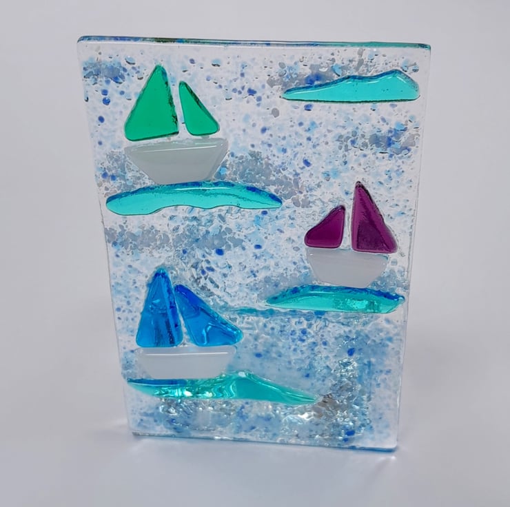 Handmade fused glass tealight holder featuring green, purple and blue boats with white sails on a wind blown sea.