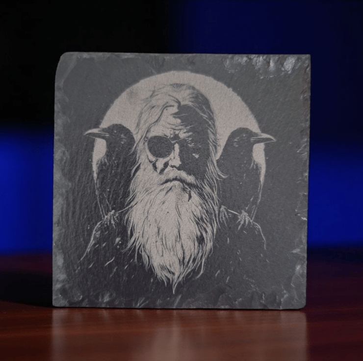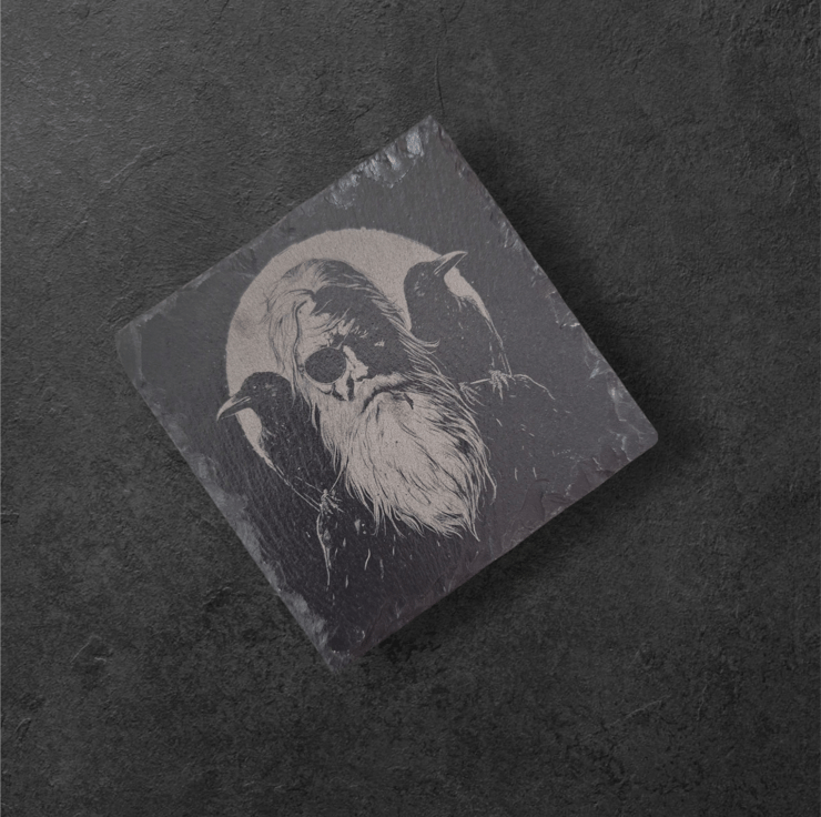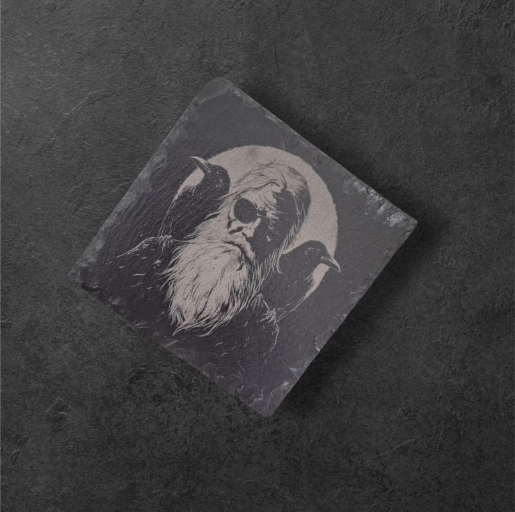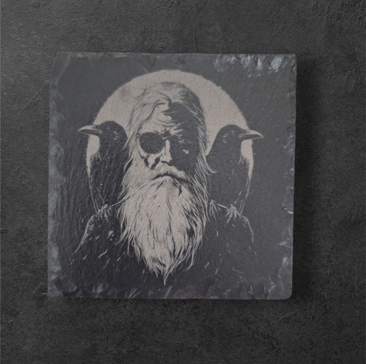 Bring the wisdom of the Allfather into your home with this beautifully engraved slate coaster featuring Odin and his two ravens, Huginn and Muninn. The design is laser-etched onto natural slate, creating a striking high-contrast finish that highlights every detail of Odin’s bearded figure and his watchful companions.