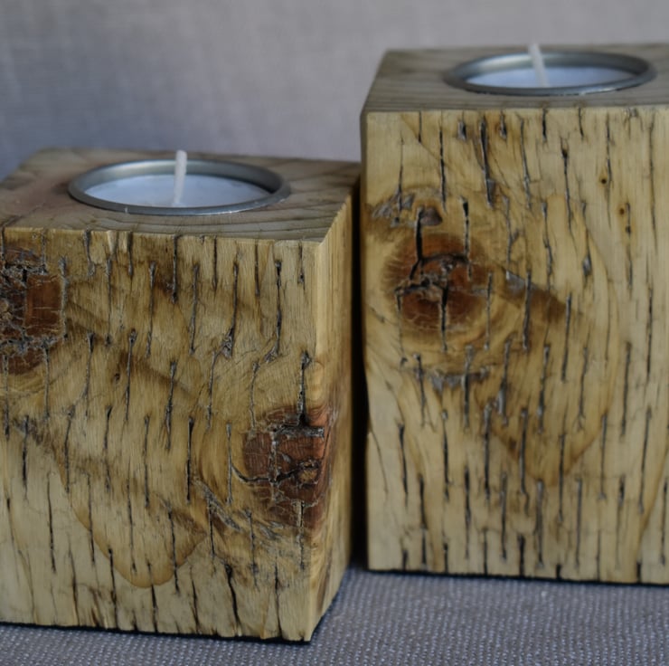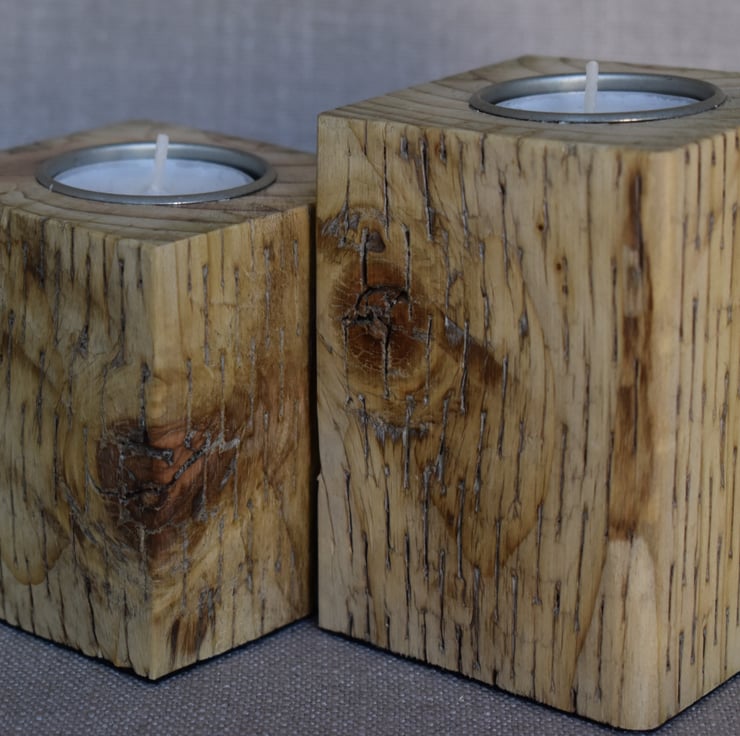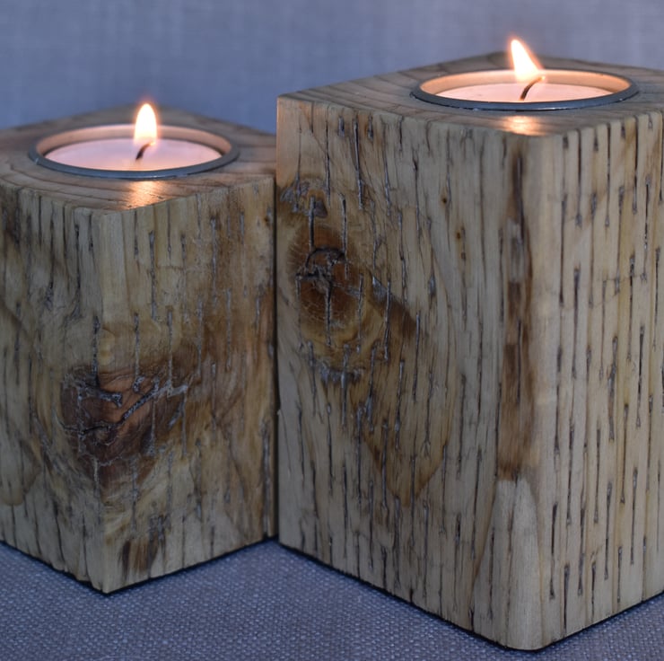 This set of two tealight holders is crafted from upcycled fence posts, showcasing a warm golden yellow wood tone that highlights the natural beauty of the timber. Each holder is shaped into a solid block, with differing heights to create visual interest when displayed together. The natural texture and subtle imperfections of the reclaimed wood are preserved, celebrating its previous life and adding rustic character. Designed to hold tealights, this pair combines sustainable materials with a warm, inviting glow—perfect as a centerpiece, shelf accent, or thoughtful handmade gift.