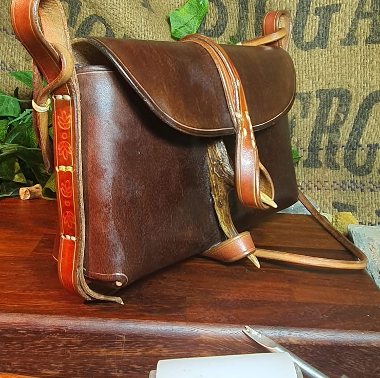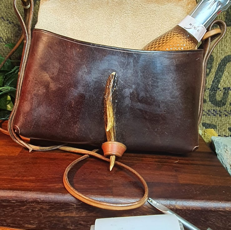 Simple yet eligent handmade bag with a looped strap fixing on Roe deer antler. Not something you see everyday.