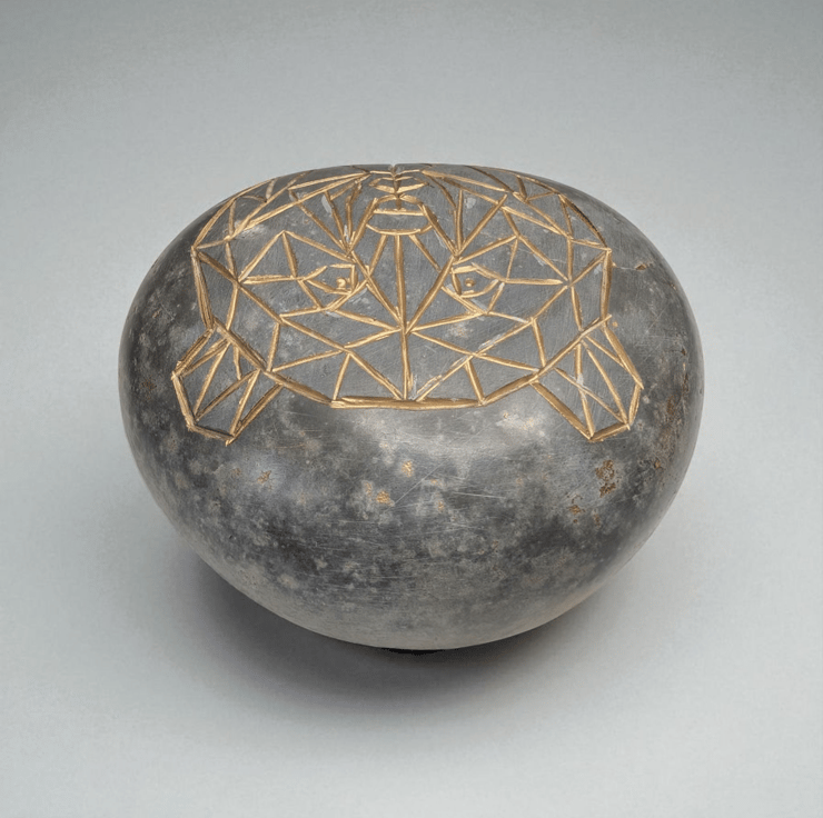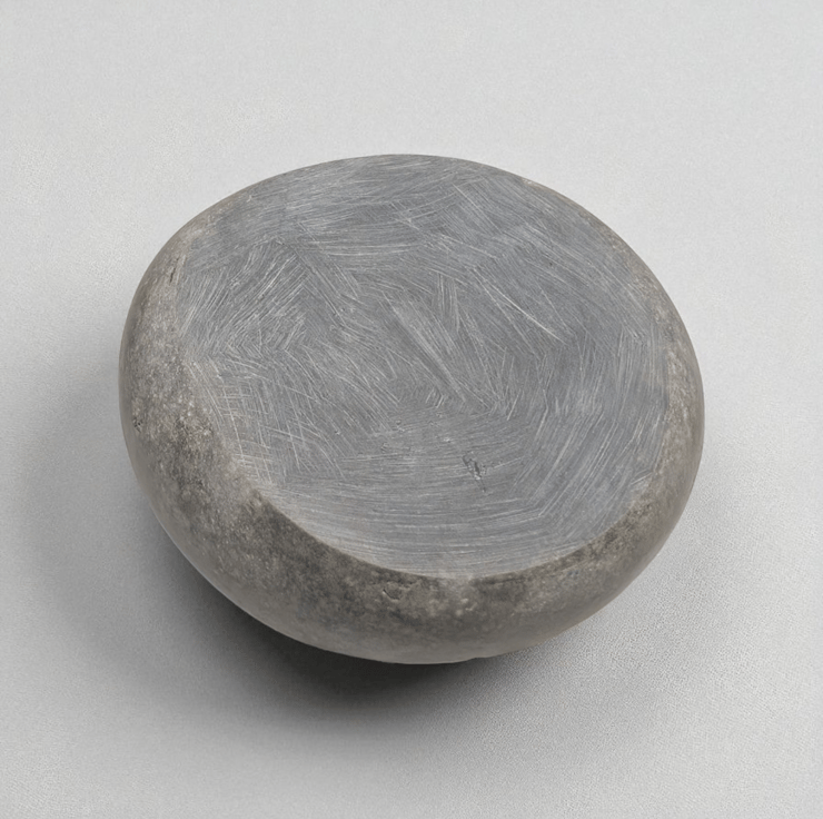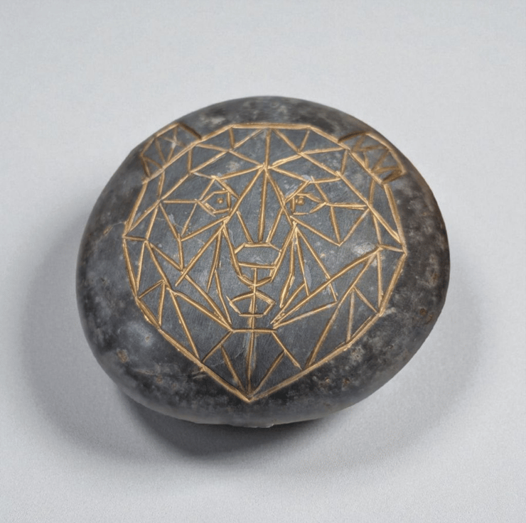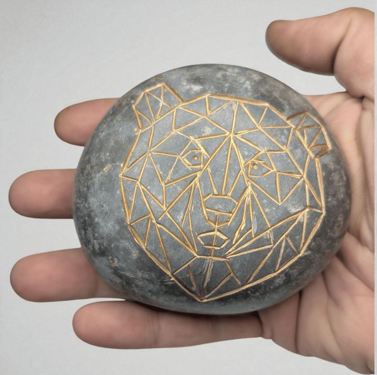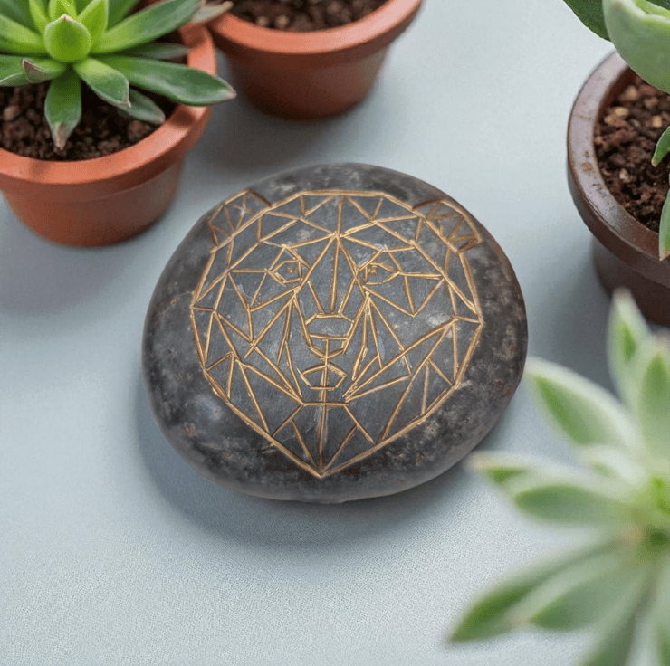 The design is engraved and highlighted with a delicate gold inlay. Each piece is shaped and smoothed by nature, then refined by hand, making every stone one-of-a-kind. The natural texture paired with the gold detail creates a piece that feels both rustic and timeless.