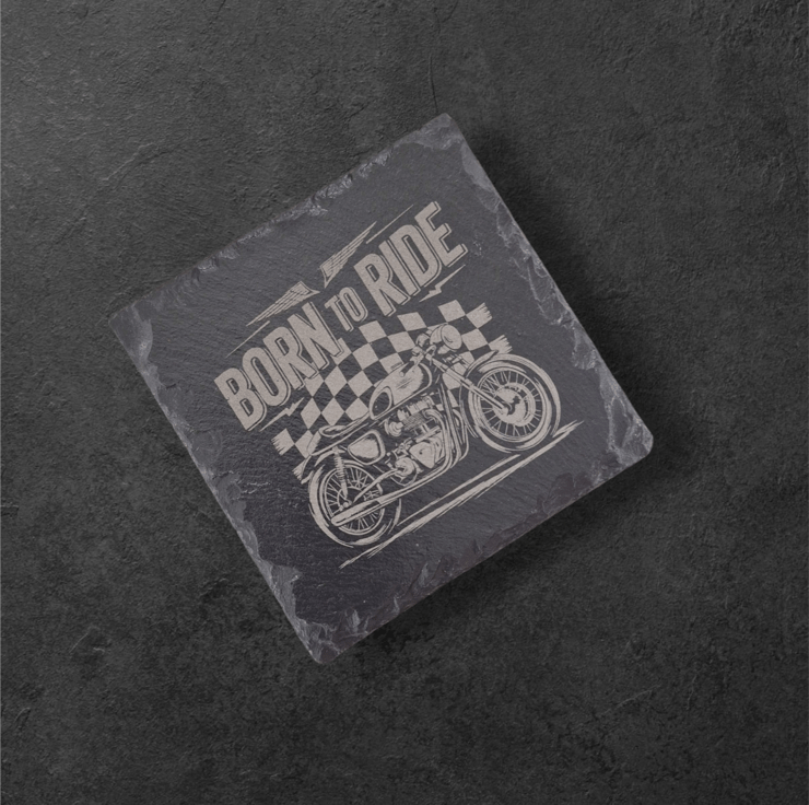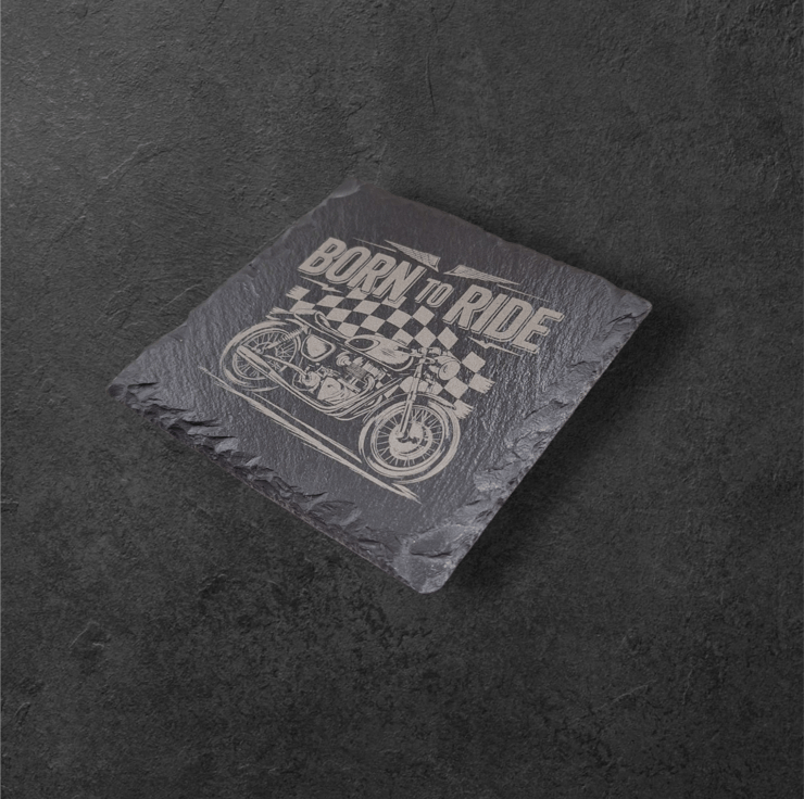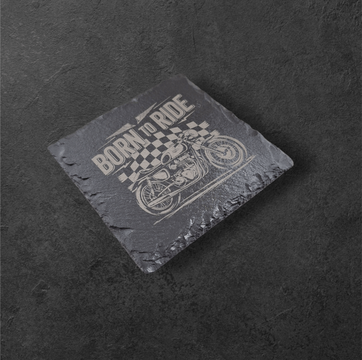 This design was inspired by the freedom and spirit of the open road. I wanted to capture the classic café racer style and the thrill of riding, then combine it with the rugged texture of natural slate. The bold “Born to Ride” message celebrates a biker’s passion, while the durable engraving ensures it lasts as long as the memories made on two wheels.