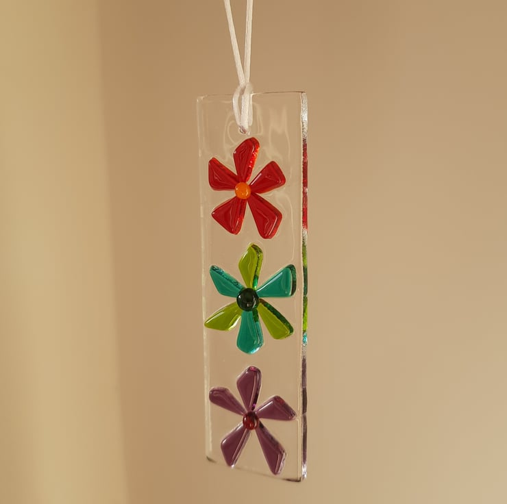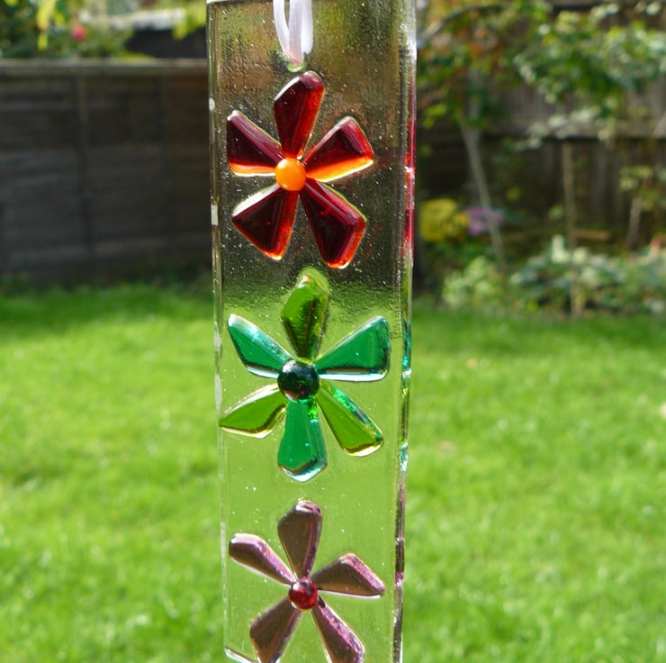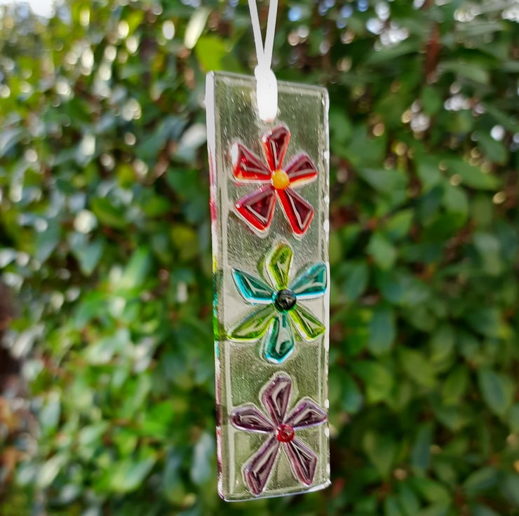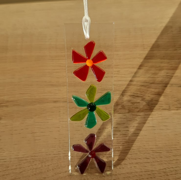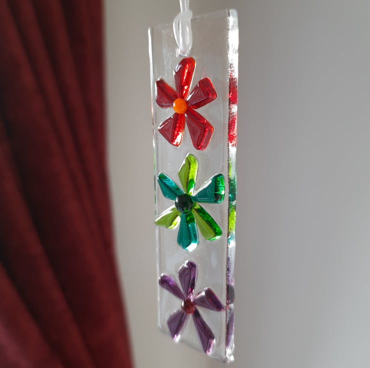 Cheerful fused glass flower suncatcher with 3 flowers, one red with an orange centre, one made of various greens and one purple with a red centre. Lovely catching the light by a window or even hung against a wall. A beautiful splash of colour, even on a dull day.