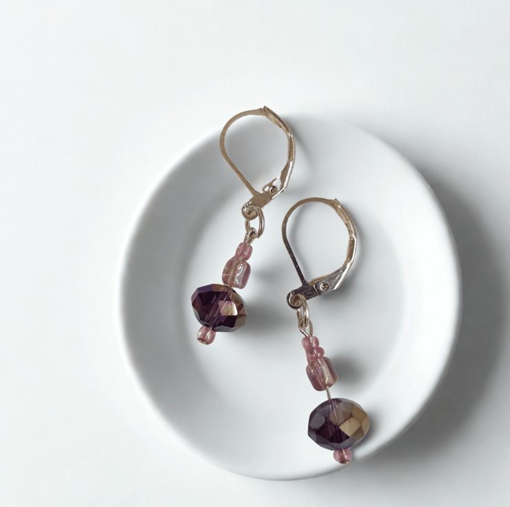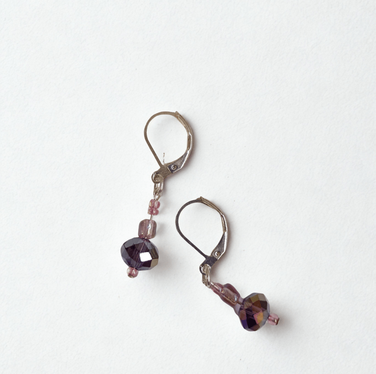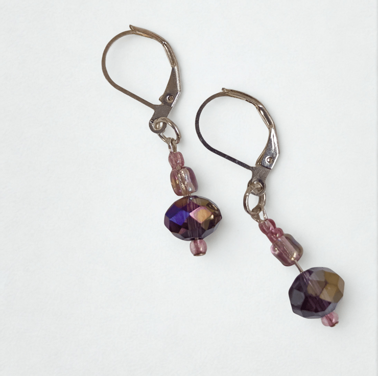 The prettiest sparkling, light catching crystal glass beads in an iridescent purple. Blended with tiny glass beads in smoky pale pink and smoky white. All beads are recycled and reimagined.Hanging on nickel free 925 silver lever back hooks.