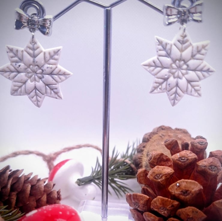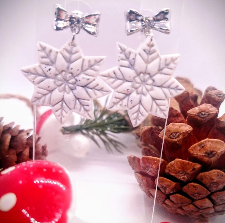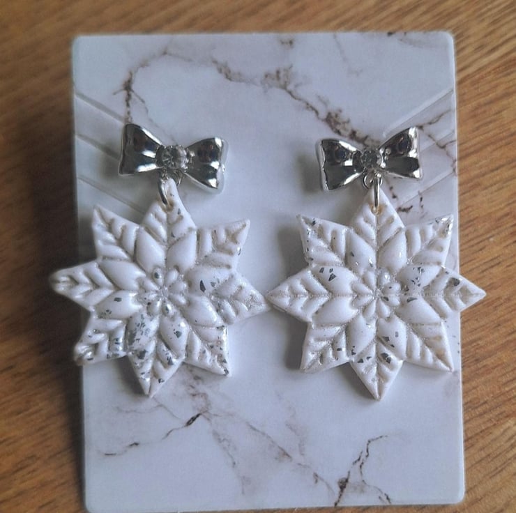 Stand out this festive period with some elegant white handmade snowflake earrings. With a silver metalic touch and topped with a sterling silver bow with diamanté.