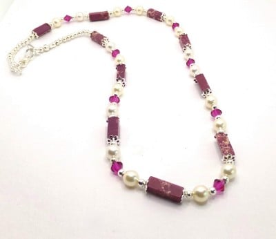 The necklace features semi-precious-gemstone Imperial Jasper 8 by 14 mm tube beads in shades of pink. These are accessorised with 5mm Precoisa bicone crystals in fuchsia and 8mm Precoisa Glass pearls also silver plated spacer beads and bead caps.
