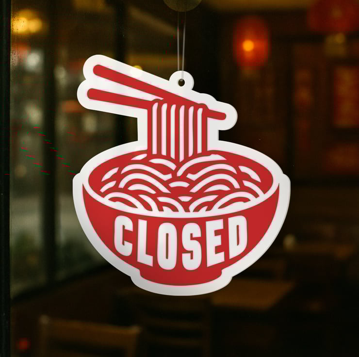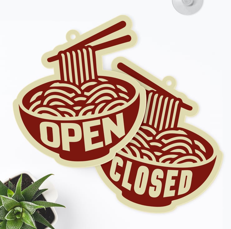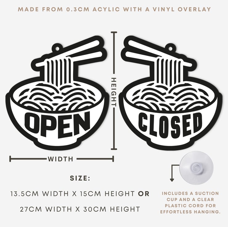 Give your business a unique and inviting look with this ramen bowl Open and Closed sign. Ideal for noodle shops, ramen bars, Asian restaurants, and takeaways, this sign features a fun steaming bowl of noodles with chopsticks design, making it both practical and stylish.