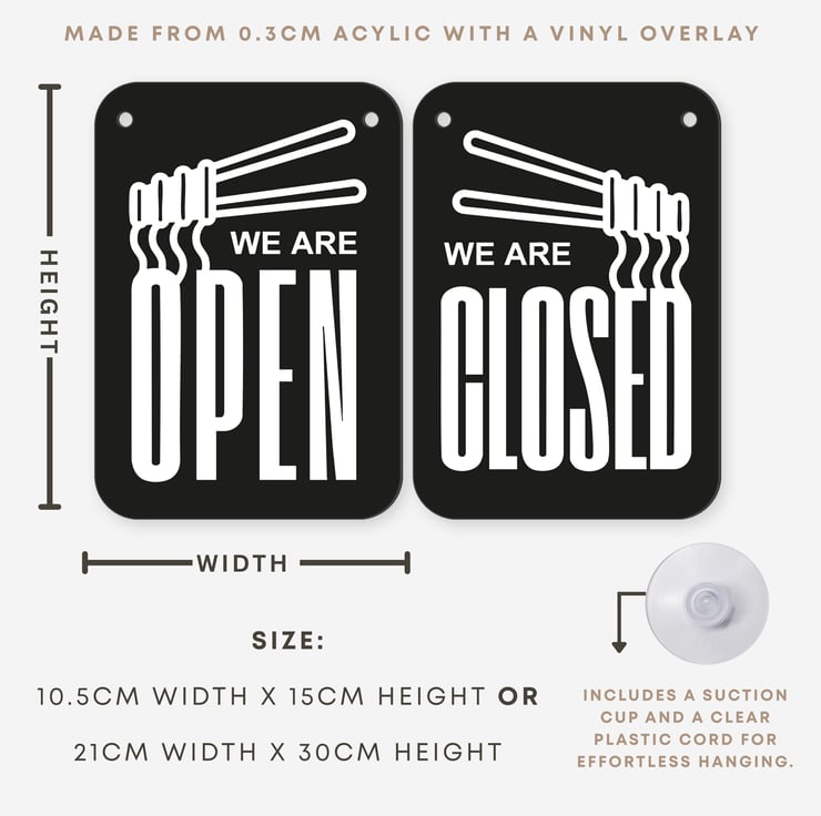 Add a sleek and modern touch to your shopfront with this chopsticks-inspired Open and Closed sign. Designed for noodle shops, Asian eateries, sushi restaurants, and cafés, this sign combines practical functionality with a stylish theme that reflects your business.