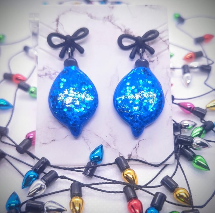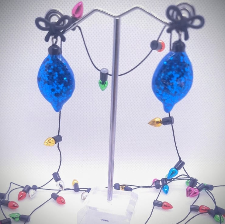 Sparkly blue christmas light/bauble earrings. Handmade from polymer clay and resin.
