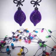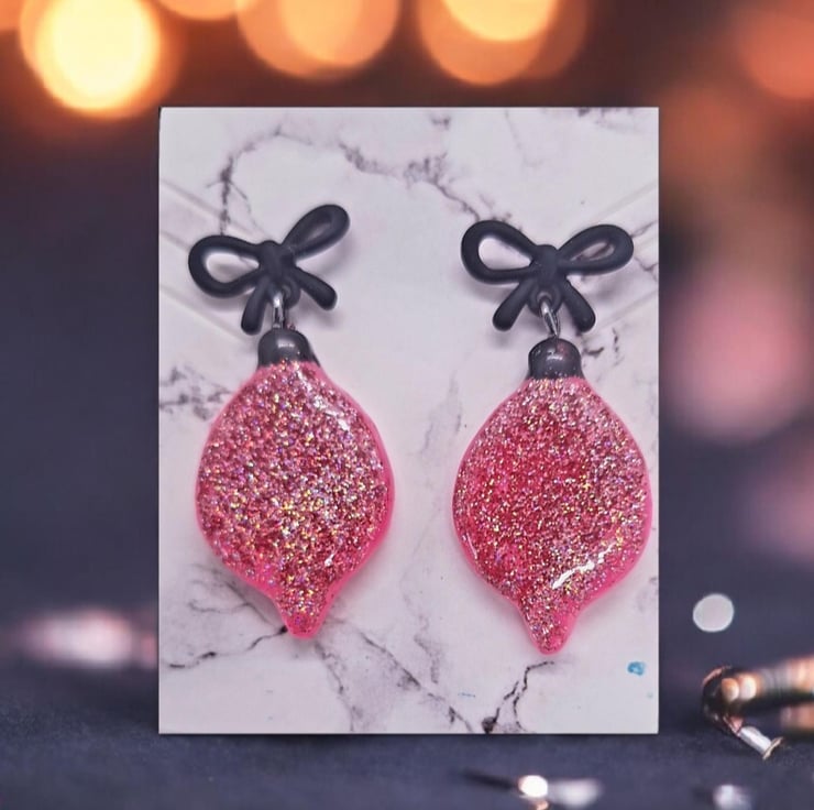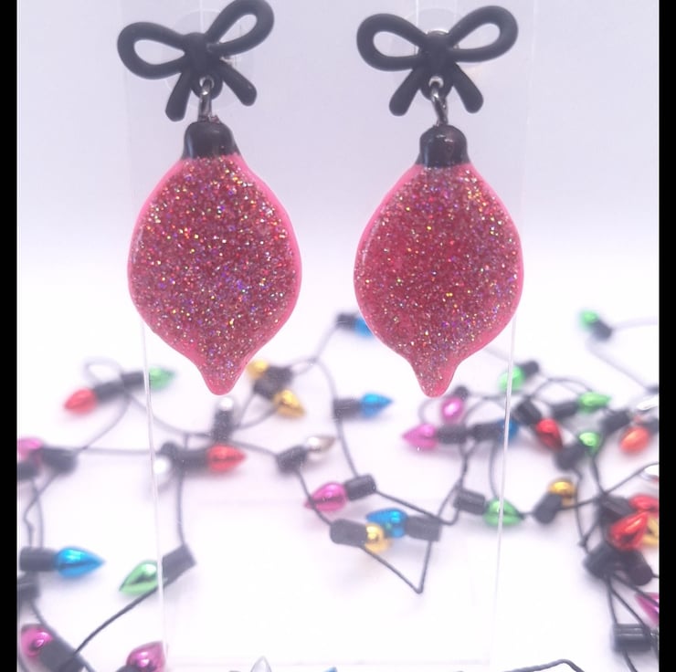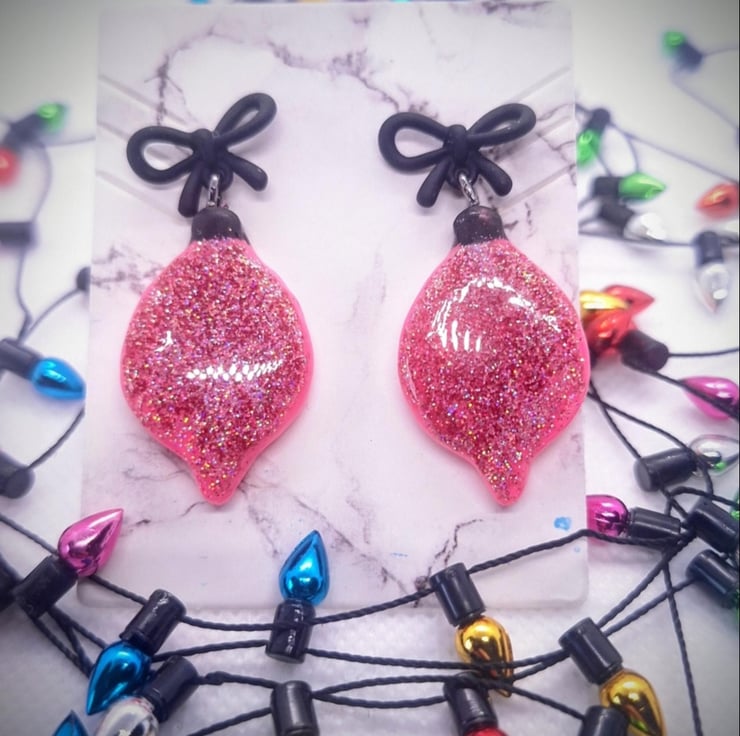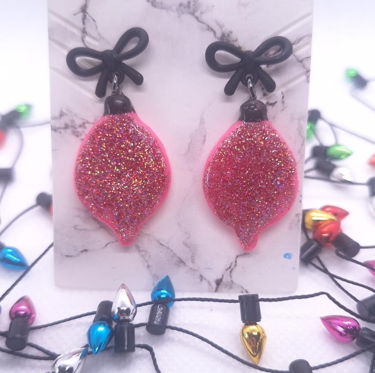 Sparkly pink christmas light/bauble earrings. Handmade from polymer clay and resin.