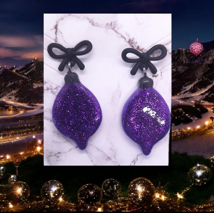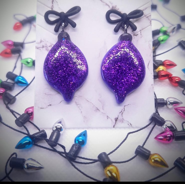 Sparkly purple christmas light/bauble earrings. Handmade from polymer clay and resin.