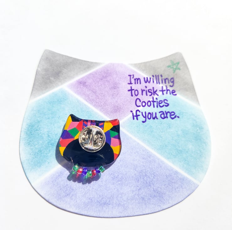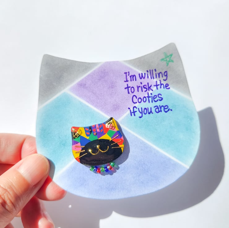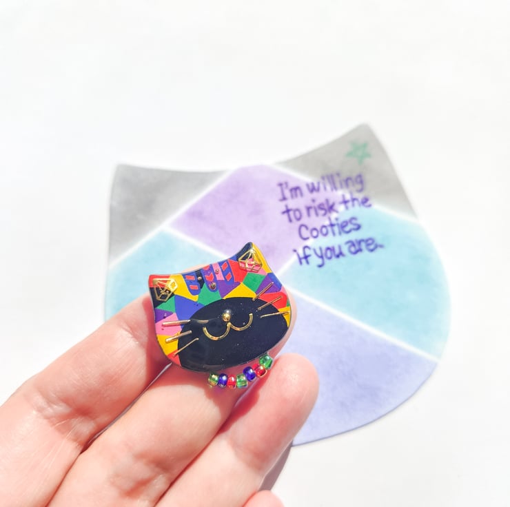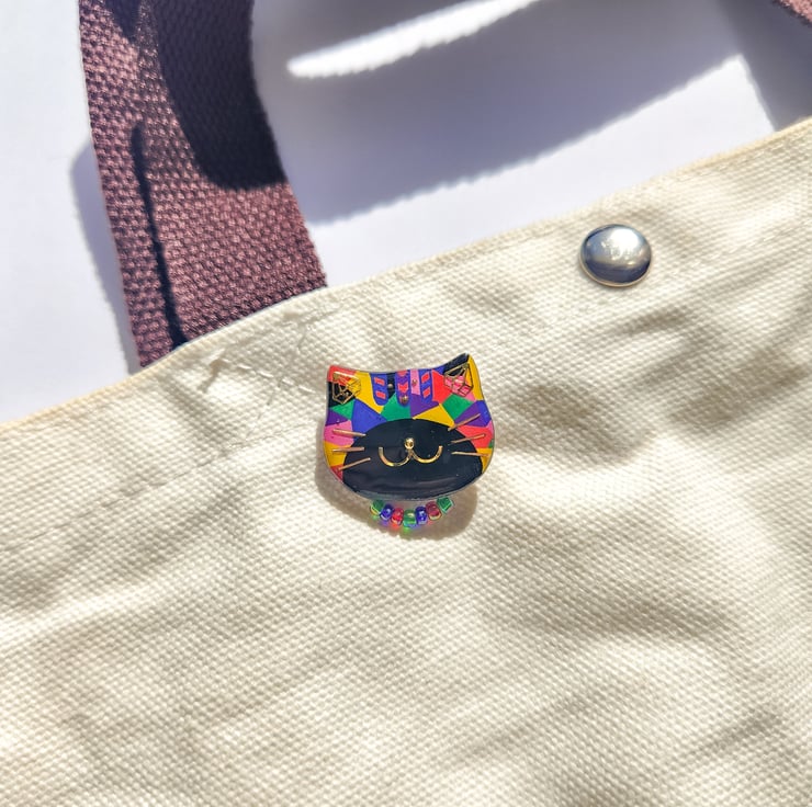 Bring a smile to your day with this cheerful hand-painted cat brooch. Made from shrink plastic and finished with delicate hand-painted details. Each brooch is completely unique, no two cats are ever the same! Cat brooch comes pinned onto a softly hand-coloured card, featuring a light-hearted phrase.