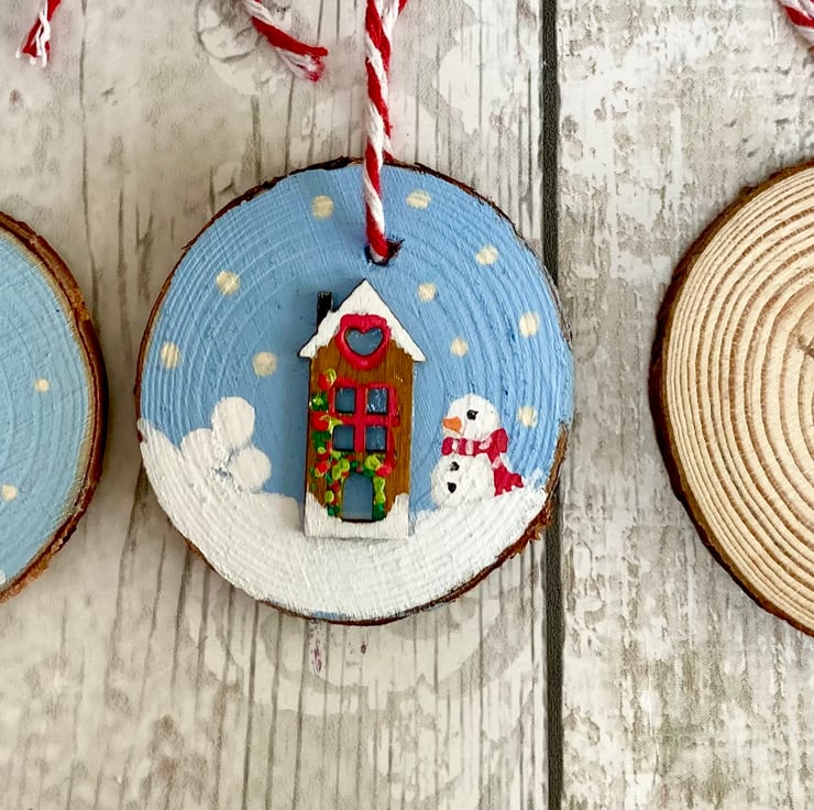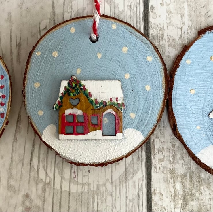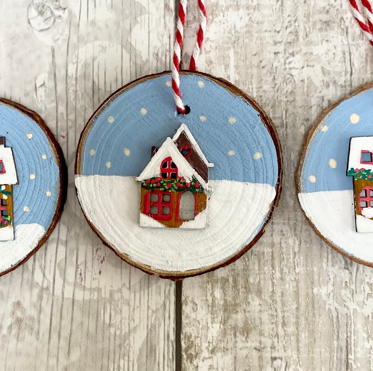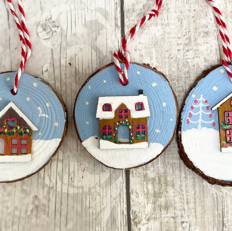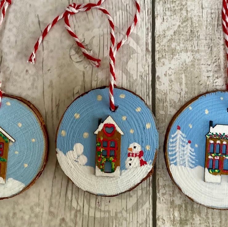 Each wood slice is decorated with a tiny wooden house (all the mini wooden houses have also been hand painted) all in festive colours and decoration.