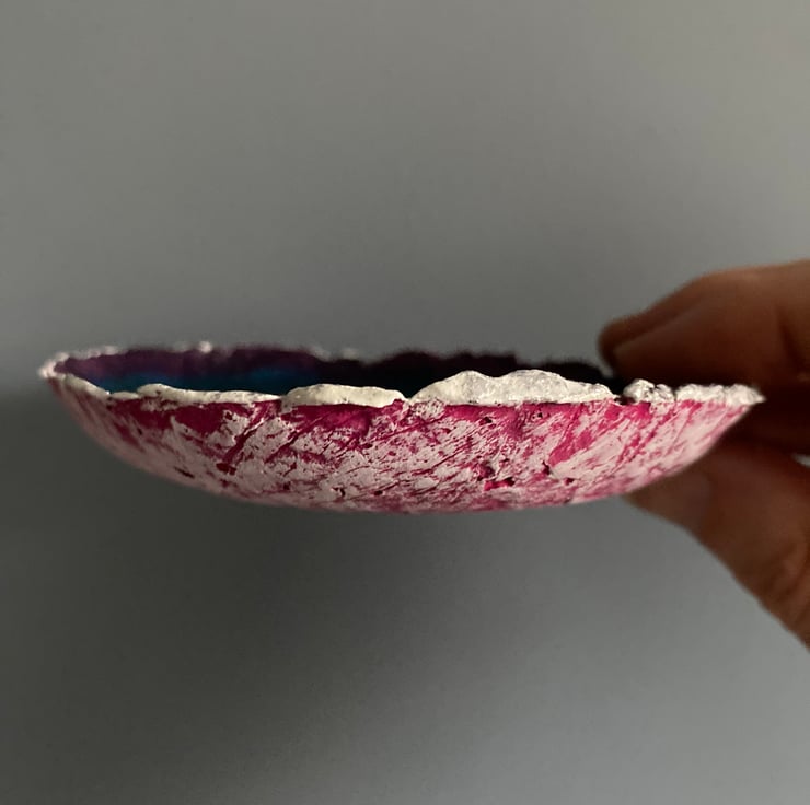 These items are a non identical pair and have an eclectic feel, embracing the wabi-sabi perfection in the imperfect. I have deliberately made them textured with an undulating rim to create a unique piece. I then painted them using layers of high quality water based paints to highlight the texture. The little shallow bowls have been varnished with several layers of acrylic varnish for protection. And, there s a little touch of silver bling.