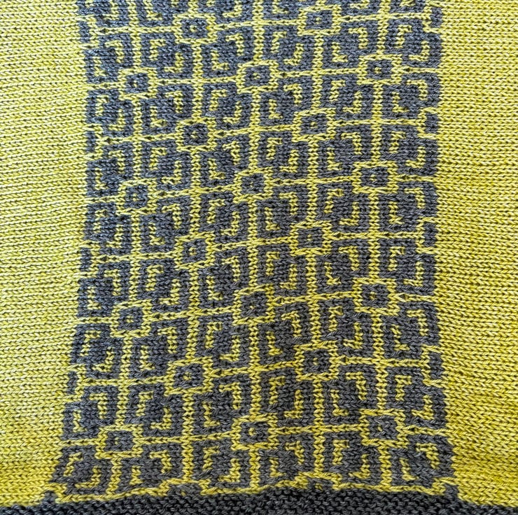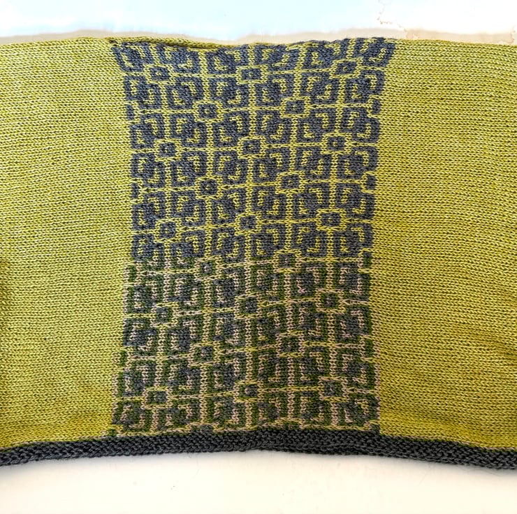 The top is worked in 2 pieces which are each worked sideways from under one arm to under the other arm. A central pattern of mosaic knitting is worked on the front piece. Once the 2 pieces are seamed across the shoulders and down the side seam, stitches are picked up and worked in garter stitch around the armholes and the bottom band.