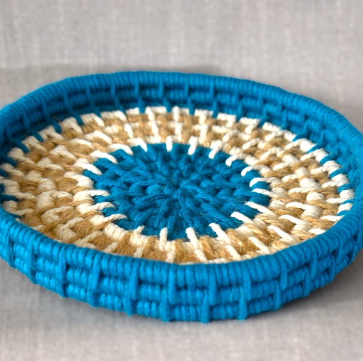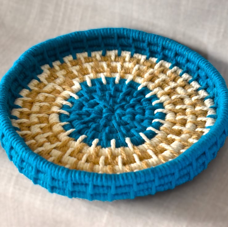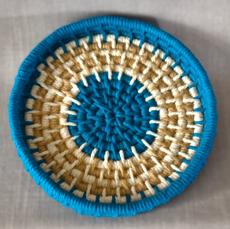This basket was inspired by the colours of nature—deep teal waters, soft sandy tones, and natural earthy textures. The combination of braided wool, cotton, and jute reflects a balance between warmth, softness, and rustic simplicity. I wanted to create a piece that is both beautiful and functional, a small vessel to hold everyday treasures like jewellery, keys, or keepsakes, while bringing a touch of handmade charm and tactile comfort to the home. Each coil is a reflection of care, patience, and a love for transforming simple fibers into meaningful, usable art