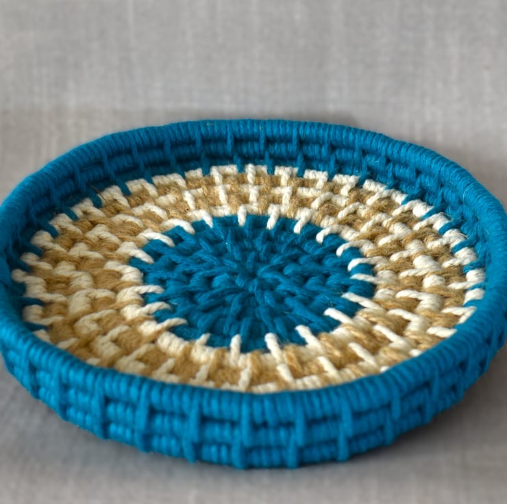 A beautifully handcrafted coiled basket made from teal braided wool, off-white cotton cord, and natural jute. The harmonious blend of colors creates a soothing, earthy aesthetic with a touch of vibrant charm. Perfectly sized to corral keys, jewellery, or other small treasures. This basket combines practicality with artisanal style. It is a sturdy, coiled construction, while the mix of braided wool and natural fibers adds texture and visual interest. Ideal for keeping everyday essentials organised or as a decorative accent, this basket brings both function and handmade beauty to any space.