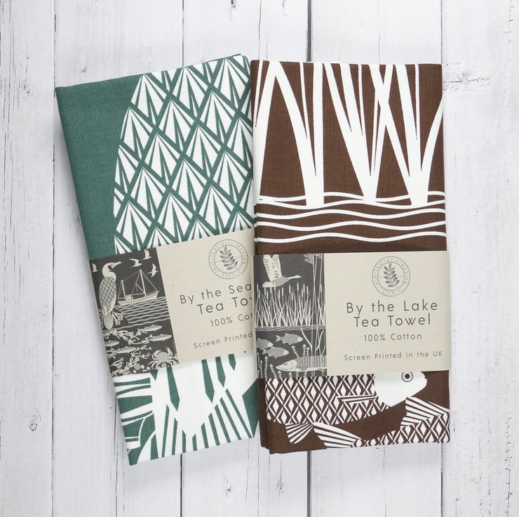These are designs taken from original lino prints and then made as single colour screen print te towels and letterpress prints.