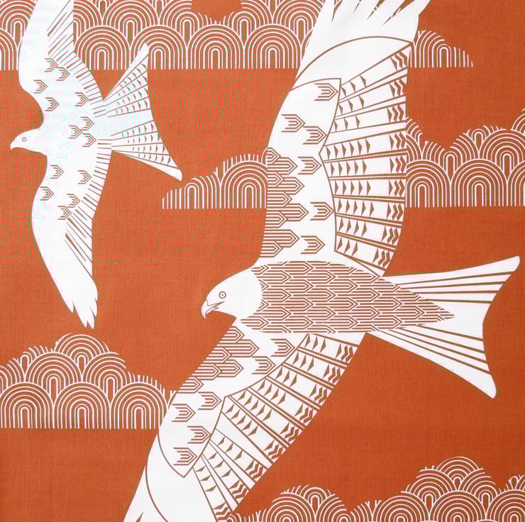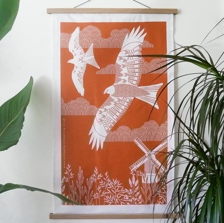 A orange red kite tea towel. Brighten up your kitchen or give it as a lovely gift with this large tea towel, also it can be hung as wall art with oak hangers.