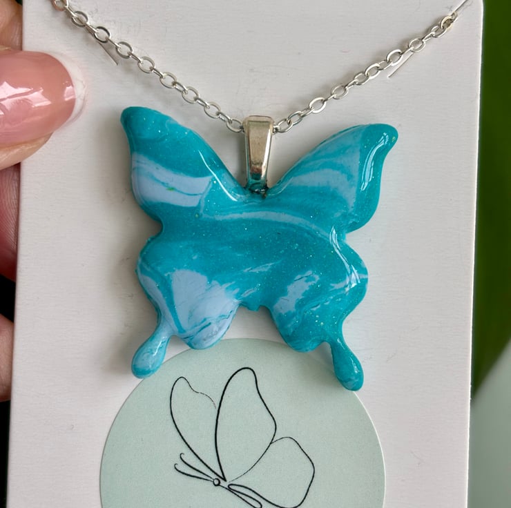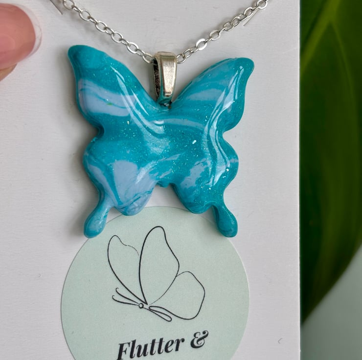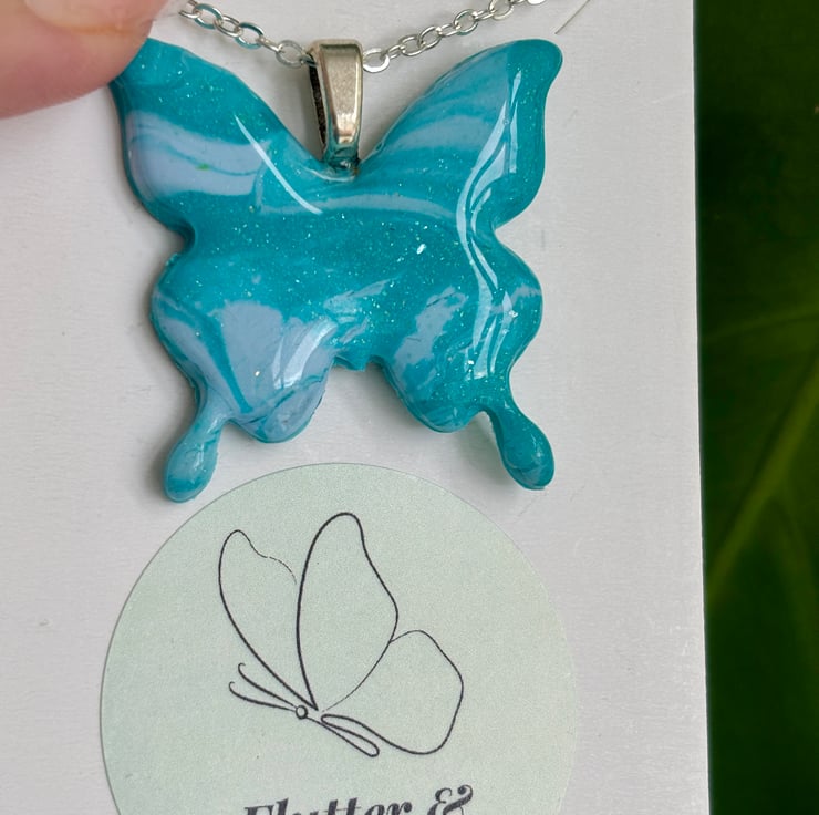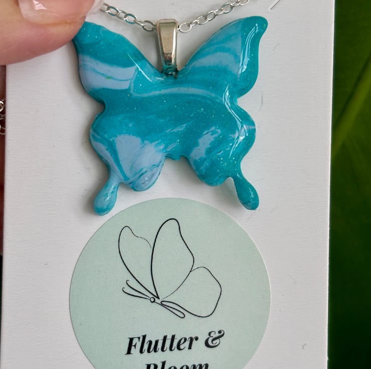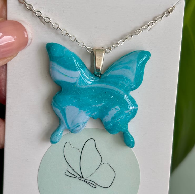 A whisper of wings, a breath of calm — this butterfly pendant necklace is a gentle ode to transformation and tranquility. Each wing is a marbled swirl of turquoise and white, each piece is one-of-a-kind, echoing the quiet beauty of nature’s brushstrokes. The stylised butterfly form adds a touch of abstraction, inviting the wearer to interpret its meaning in their own way.
