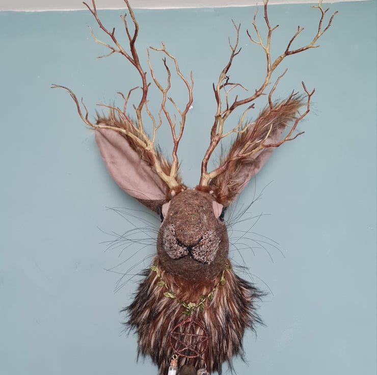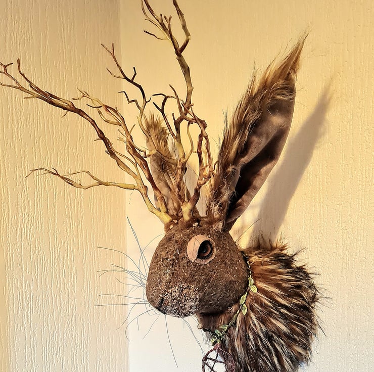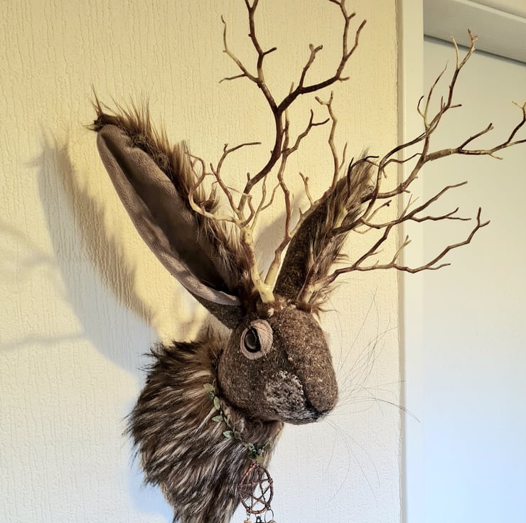 A lifesize faux jackalope (mythical hare with antlers) which I have handmade and covered in hand stitched wool felt and mottled faux fur fabric and velour. The jackalope has acrylic faux branch antlers.