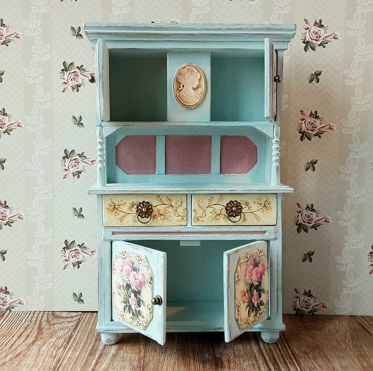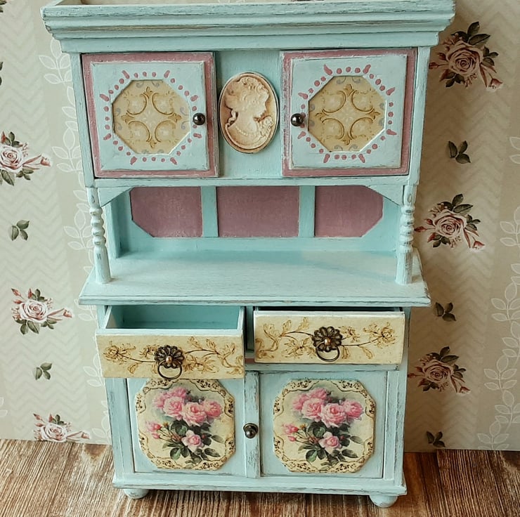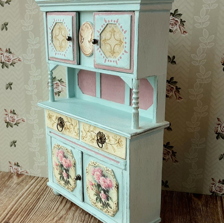 This stunning shabby chic dolls house dresser has been designed and handmade by me, so is completely unique.