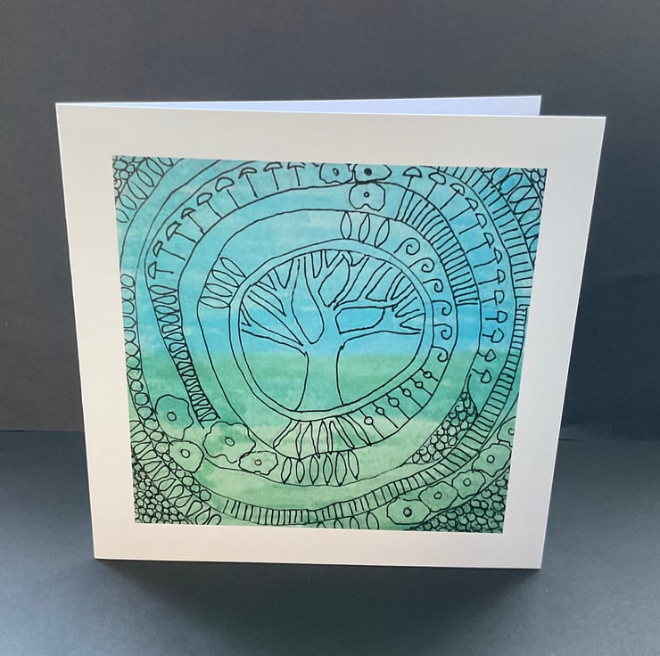This card is a design in watercolour and ink, and is blank inside for your own greeting .It features a modern design,in shades of blue in an abstract style, and based around a tree .The card would be suitable for a birthday,friend,relative,or as a thank you .