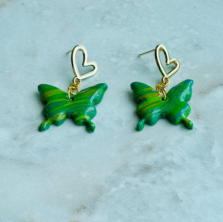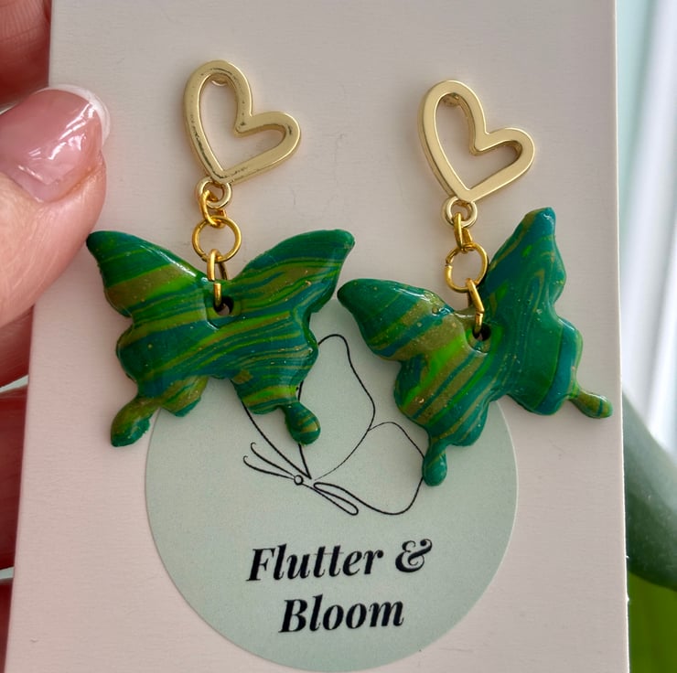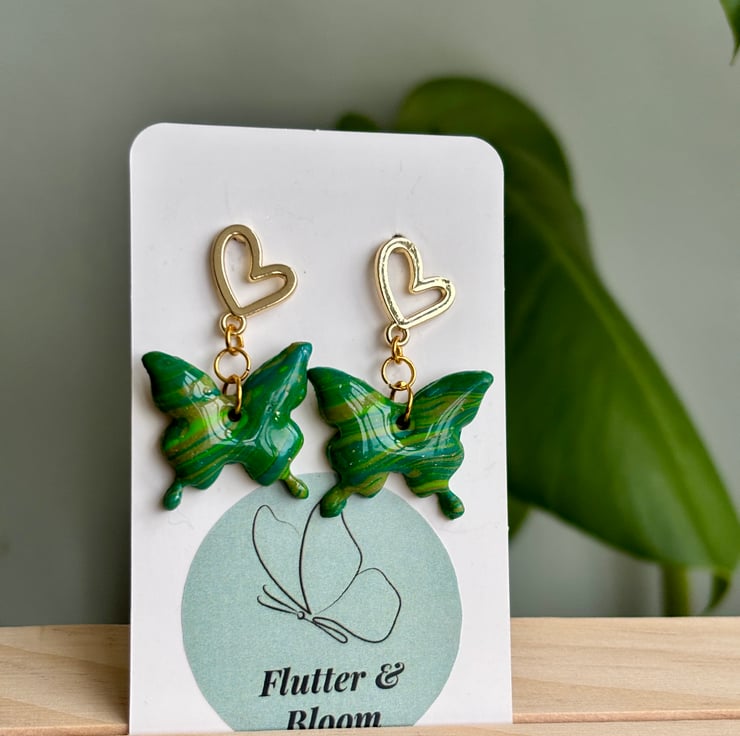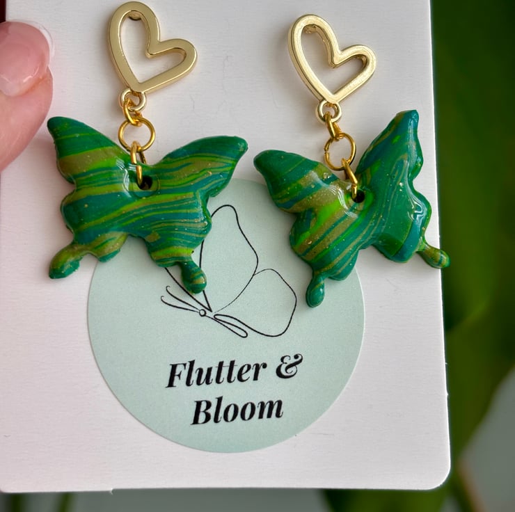 These butterfly earrings are a gentle nod to forest light and leafy whispers — sculpted from polymer clay in rich green tones, marbled with hints of yellow and deeper mossy hues. Each winged pendant is sealed with a glossy resin finish, giving them a luminous, dew-kissed sheen. Suspended from gold-toned heart studs, they offer a romantic twist on nature’s quiet beauty.