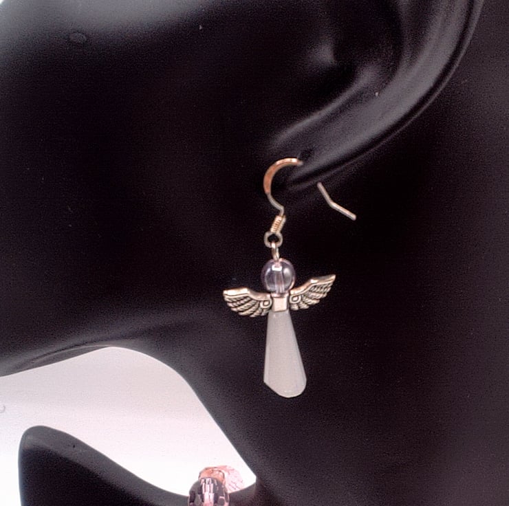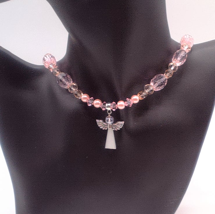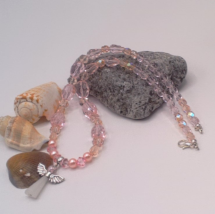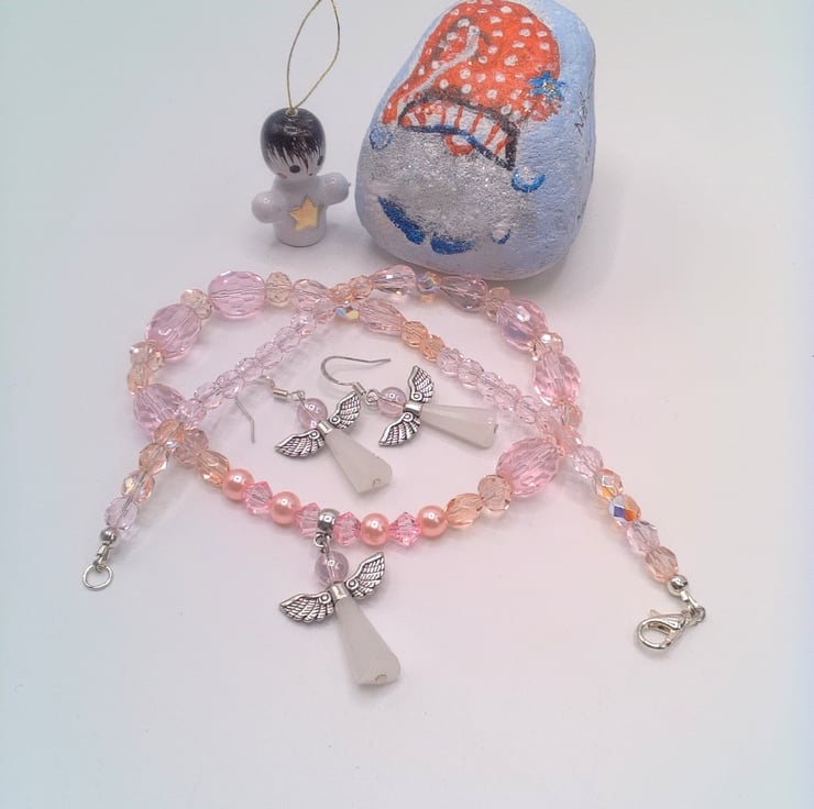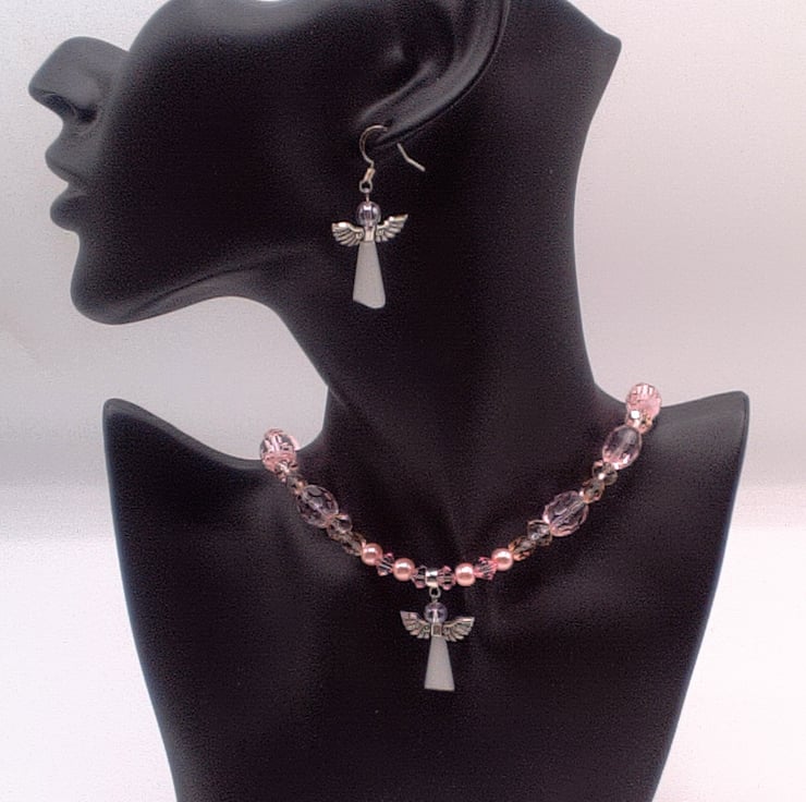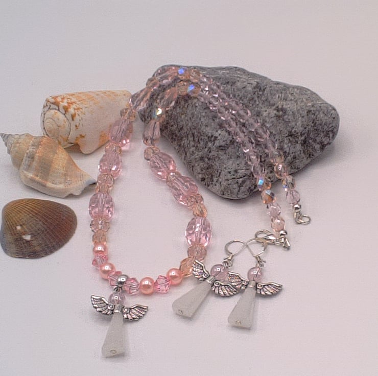 The angel pendant and earrings are made using silver plated 20 mm wide angel wings, a pale pink 6 mm glass bead, and a white long tapered 15 mm x 8 mm tube bead for the skirt. The pendant is suspended on an 18 in (46 cm) necklace made with 6 mm pink crystals with an AB coating, 12 mm x 8 mm pink crystal drop beads, 15 mm x 10 mm oval pink crystal beads, 8 mm x 6 mm pink crystal rondelle beads, 8 mm pink crystal bicone beads 6 mm pink glass pearls. The angel pendant is suspended on a silver plated bail and the necklace is fastened with a silver plated lobster clasp and the earrings have silver plated hook ear wires with a 3 cm drop. The necklace and earrings will be dispatched wrapped in tissue paper in an organza bag and delivered to you via Royal Mail 1st class post.