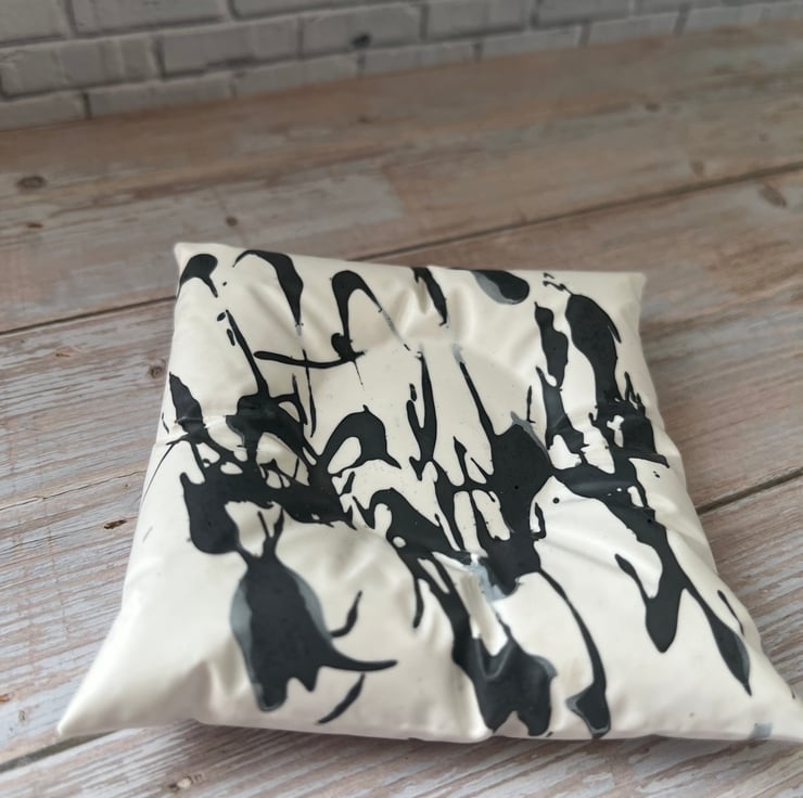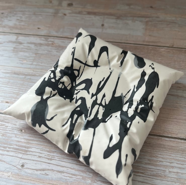 This creamy white cushion-shaped T-light holder is more than a perch for candlelight—it’s a miniature canvas of contrast. Adorned with a bold black graffiti-style pattern, it brings a whisper of urban edge to any space, without ever shouting. Measuring a neat 3x3 inches, it’s the kind of small statement that quietly transforms a shelf, bedside table, or windowsill.