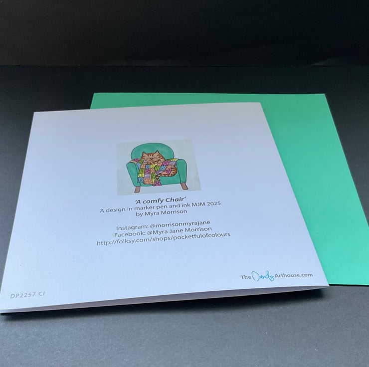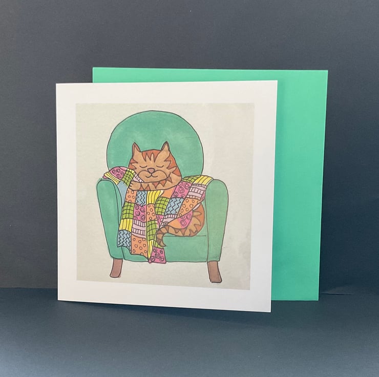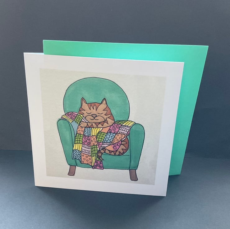 This card is a design in marker and ink, and is blank inside for your own greeting .It features a cute cat curled up in a comfy chair .The card would be suitable for a birthday,friend,relative,or as a thank you .