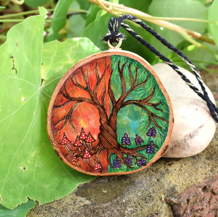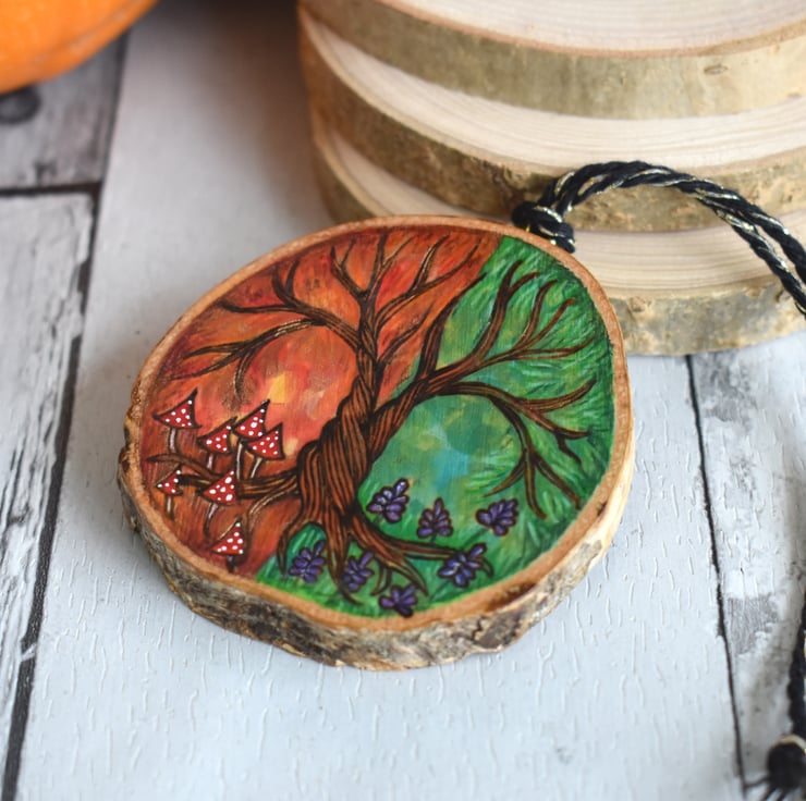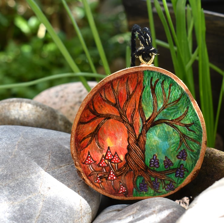A tree of life hand burned pyrography hanging decoration. Rustic wood slice, with live bark edge featuring a twisted tree, with half in summer and half in Autumn, complete with wildflowers and toadstools. Original art, burned using Pyrography and coloured using art pencil.
