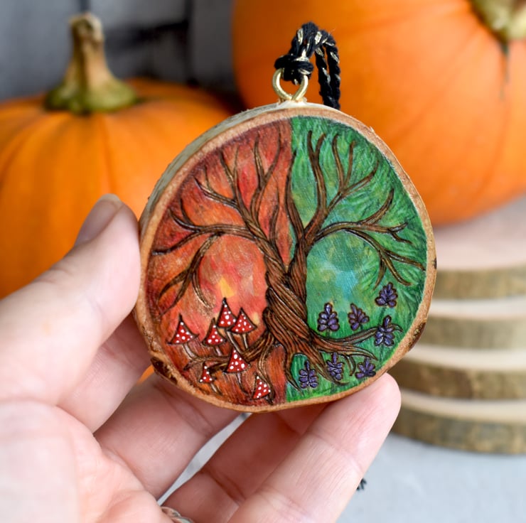Summer to Autumn Tree, Pyrography with colour wood slice hanging decoration.