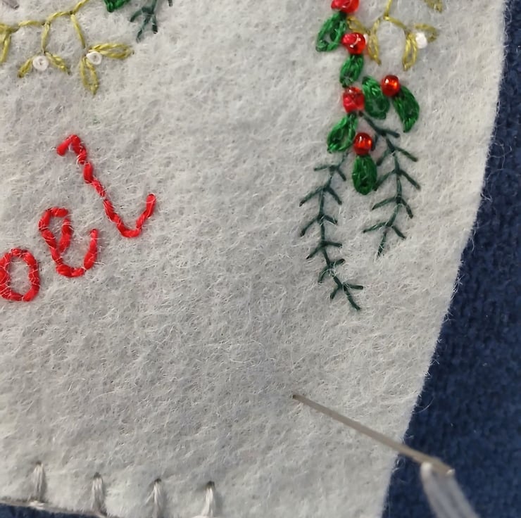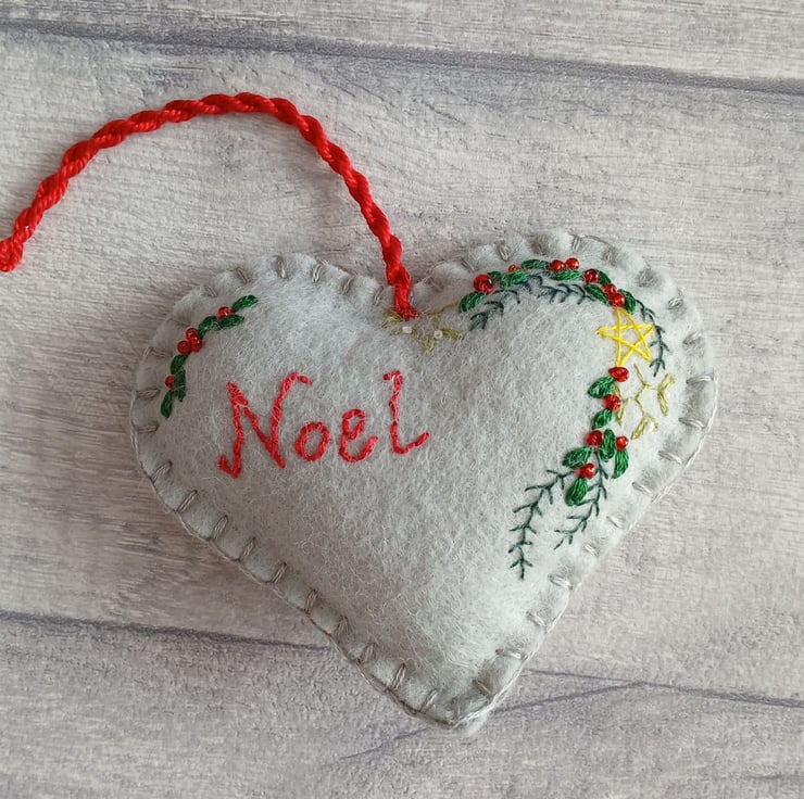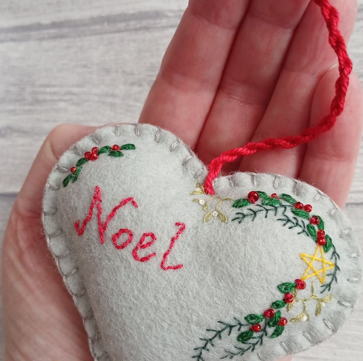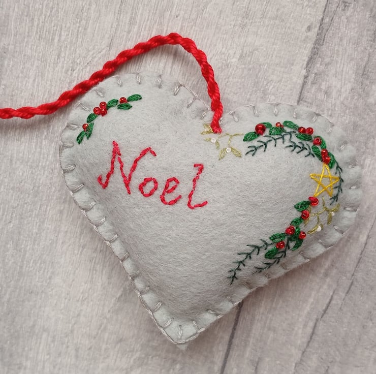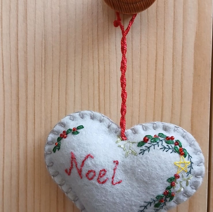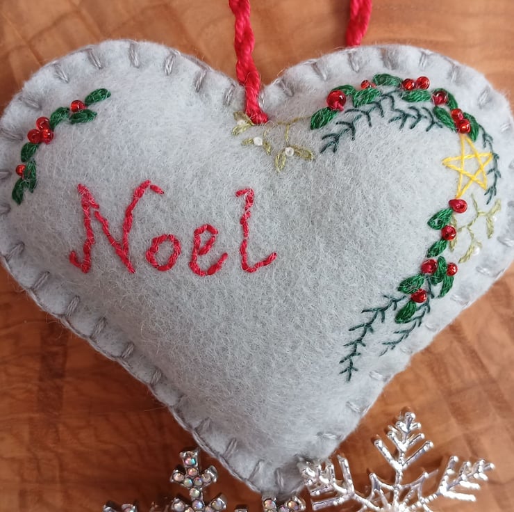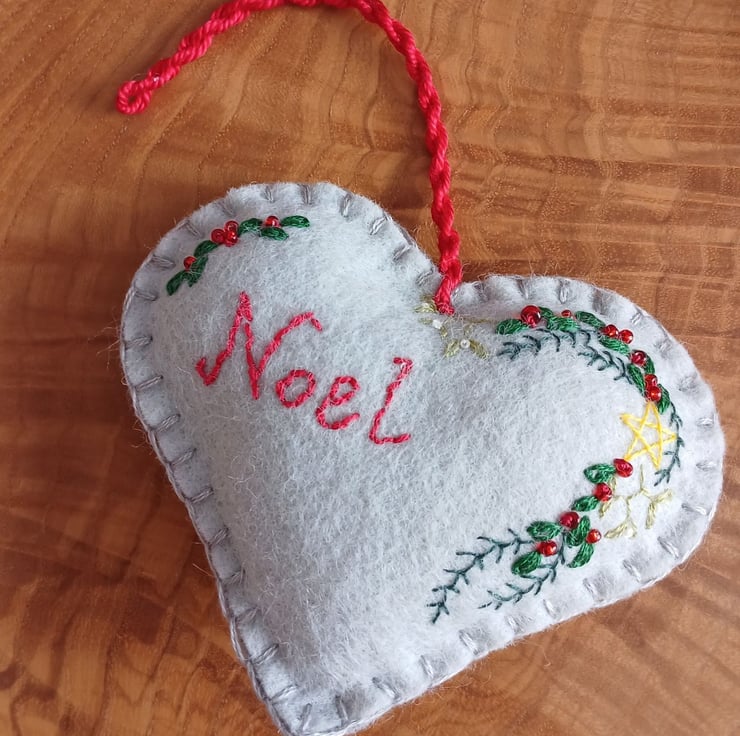 The first of this year's 'special' festive decorations - a silver grey, wool felt heart, hand embroidered with an asymmetric design featuring the word Noel in crimson, a sweep of holly - with tiny, red glass, seed beads for berries - mistletoe, pine, and a single golden star. The heart is lightly padded and finished with matching blanket stitch and a red, twisted thread, hanging loop - simply untwist, place loop over branch and allow to re-twist.